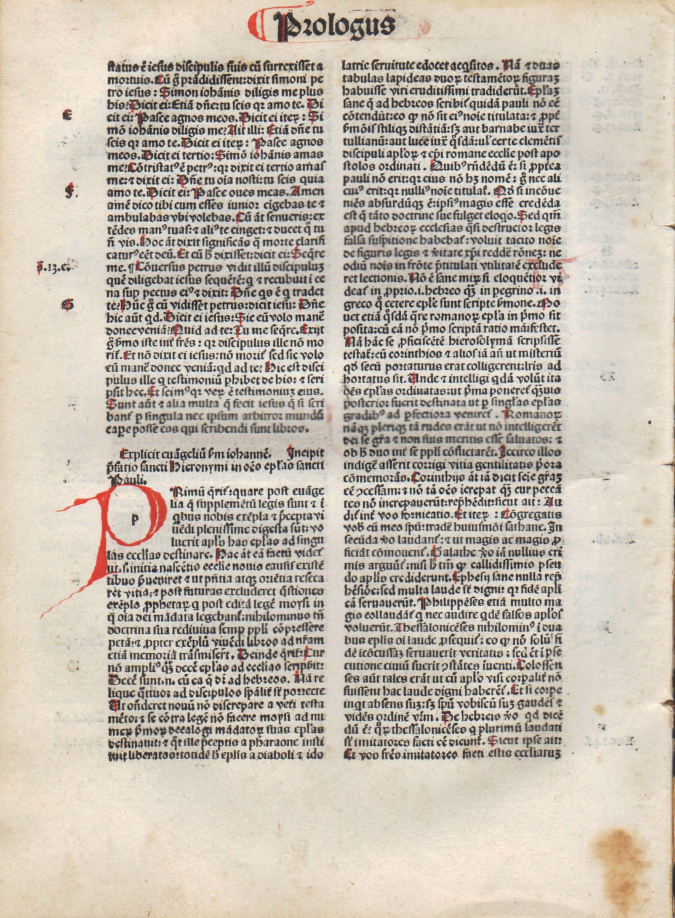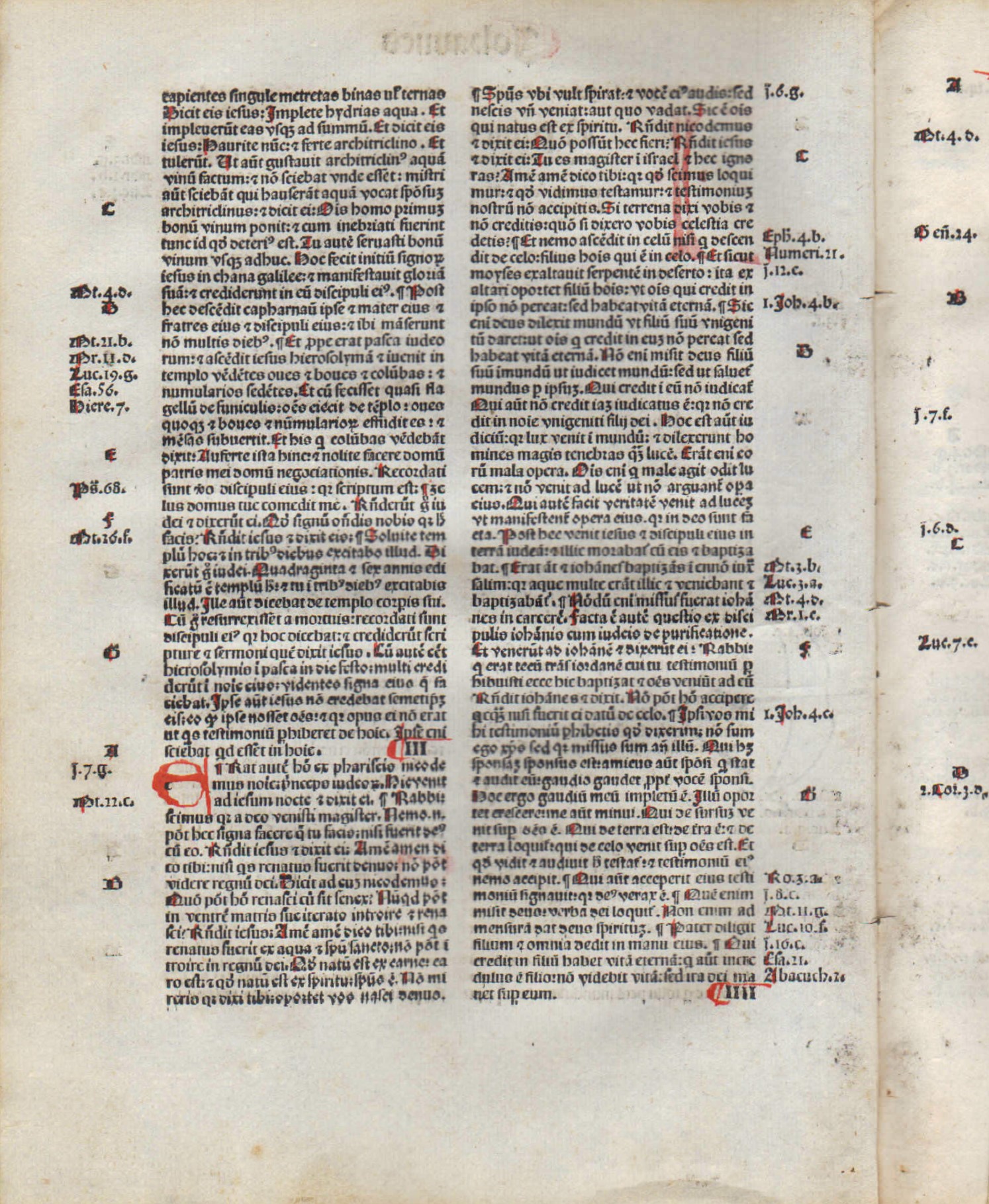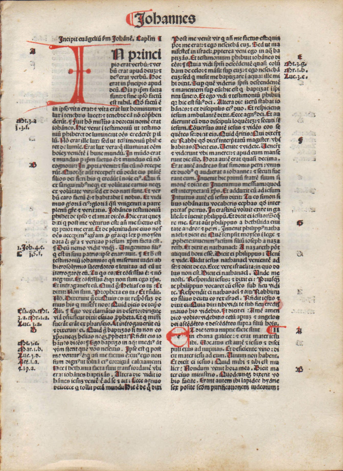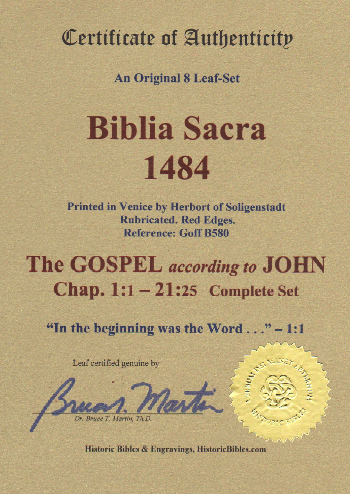JOHN 1:1-21:25, Complete in 8 leaves + Prologue to the Epistles of Paul. “In the beginning was the Word . . .” 1:1.” The Latin Bible (Biblia Sacra), in Latin. Printed in Venice by J. Herbort, April 30, 1484. Goff B580. Rubricated. Red edges. 9.25″ x 6.75″. With 21 Handpainted Capitals in Red. All leaves are still bound together with the original binding glue. EXCELLENT condition; minor smudge to bottom corner of final 2-3 leaves, tapering off to nothing (see pics of last page). Some scholars view John’s passion and resurrection account as most historically accurate and theologically mature. The 8 leaf-set and premium COA are set in a black, buckram style, magnetic box for safekeeping. A magnificent, complete set that includes the powerful opening verses as well as the wildly popular John 3:16, all the “I AM” sayings, the three extant relics of Jesus’ crucifixion (shroud, sudarium, titulus), and everything else! The first leaf alone is valued at $500.