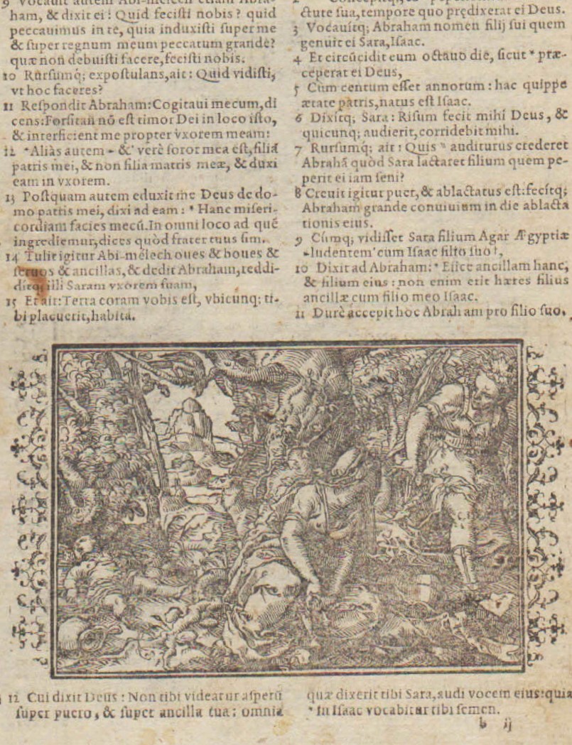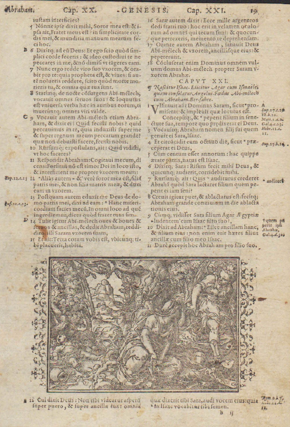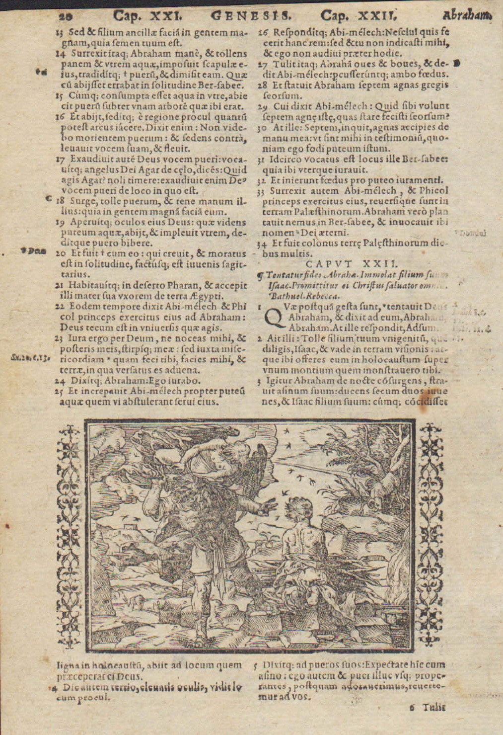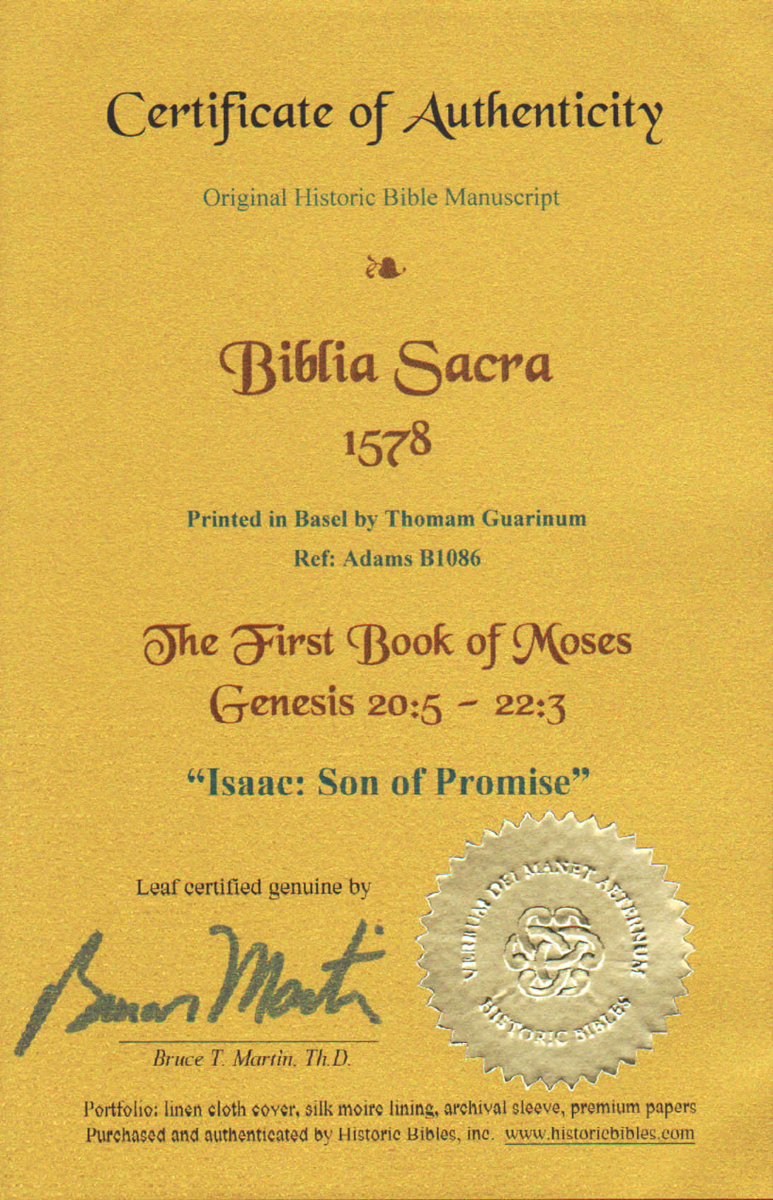 GENESIS 20:5-22:3. “Isaac: Son of Promise”. Printed in Basel by T. Guarinum, 1578. Ref: Adams B1086. FINE condition; a few light spots (see pics). The story of Sarah and Isaac, with 2 large woodcuts, each of them 3.3″ x 2.3″, of Sarah and Hagar, and of the iconic near-slaying of Isaac. COA on premium “gold leaf” paper. Leaf and COA set in a museum-quality Tri-fold Portfolio.