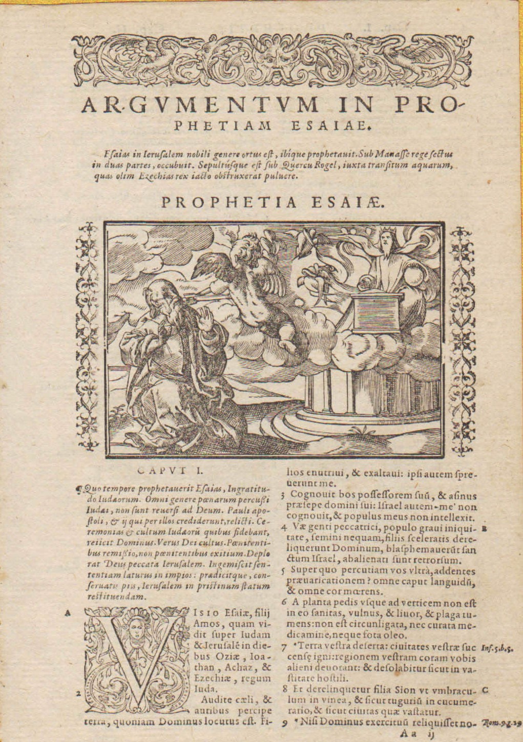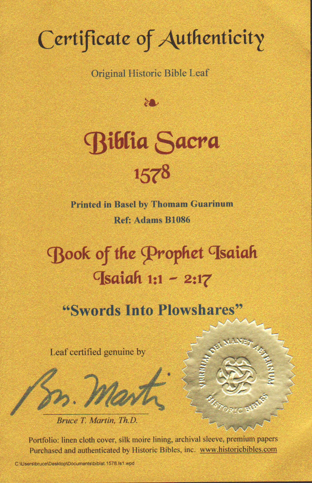 ISAIAH 1:1-2:17. Title. “Swords Into Plowshares.” Printed in Basel by T. Guarinum, 1578. Ref: Adams B1086. EXCELLENT condition. 1 LARGE WOODCUT 3.3″ x 2.3″ of Isaiah before the throne of God, and 1 large inhabited initial “V”, 1″ x 1″. COA on premium “gold leaf” paper. Text recounts the call of Isaiah and his message of peace. Leaf and COA set in a museum-quality Tri-fold Portfolio.
