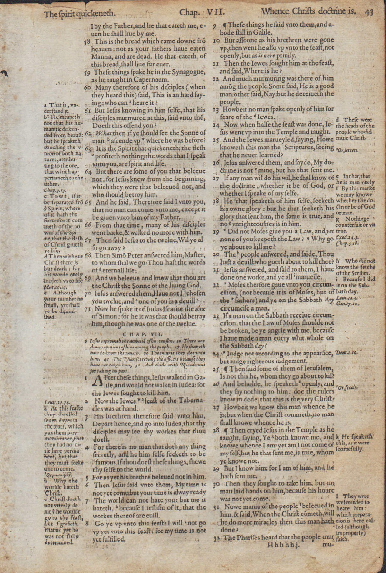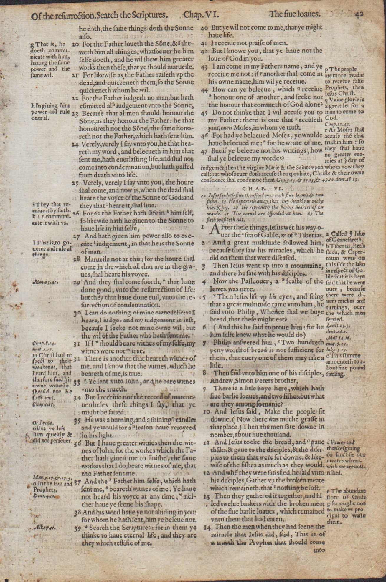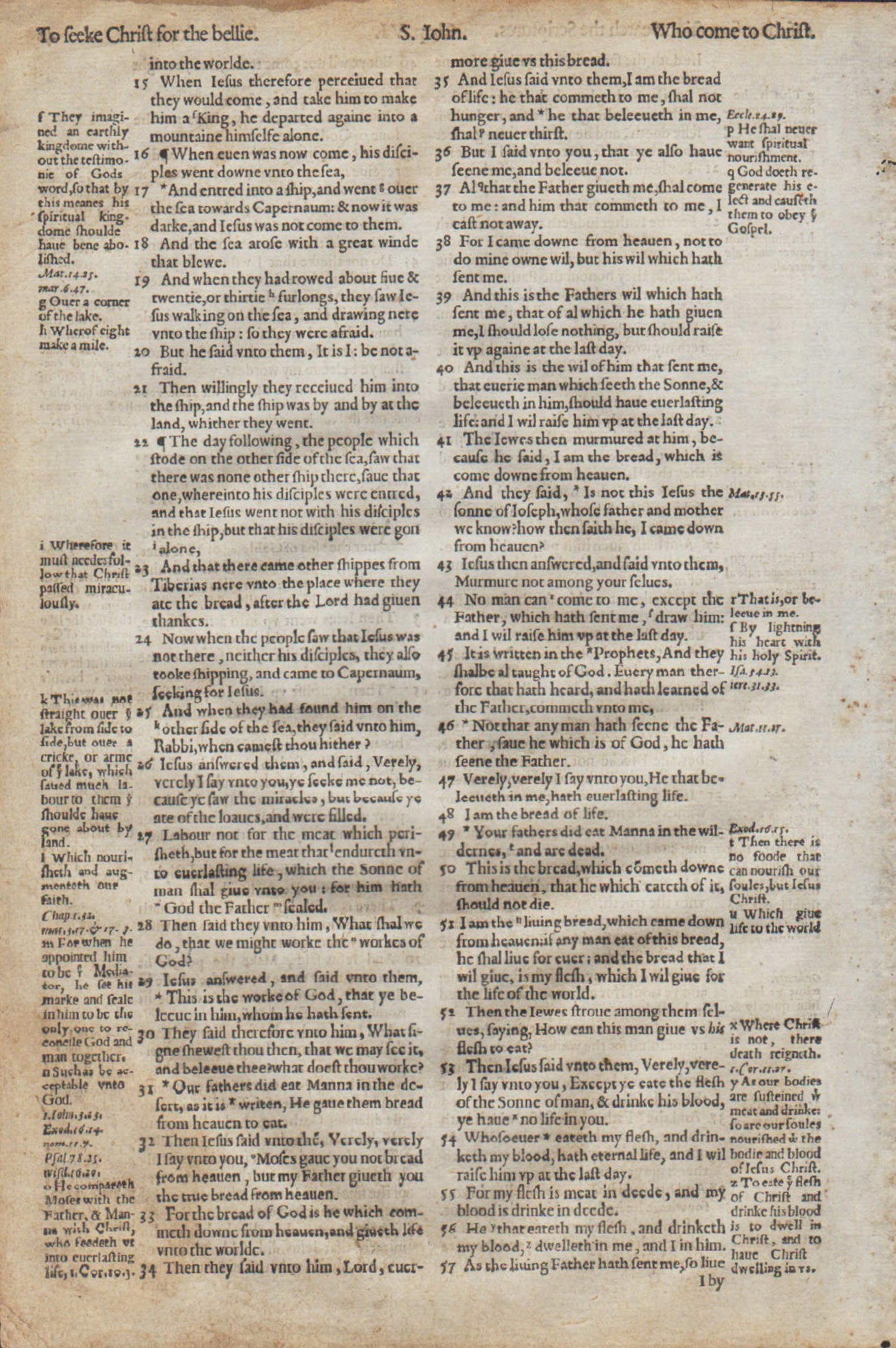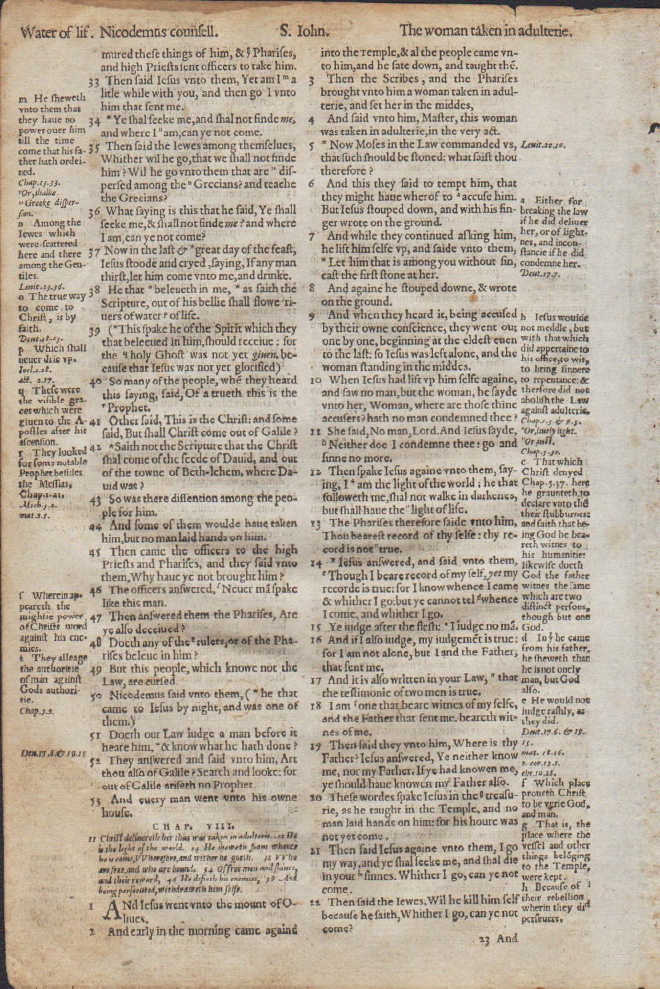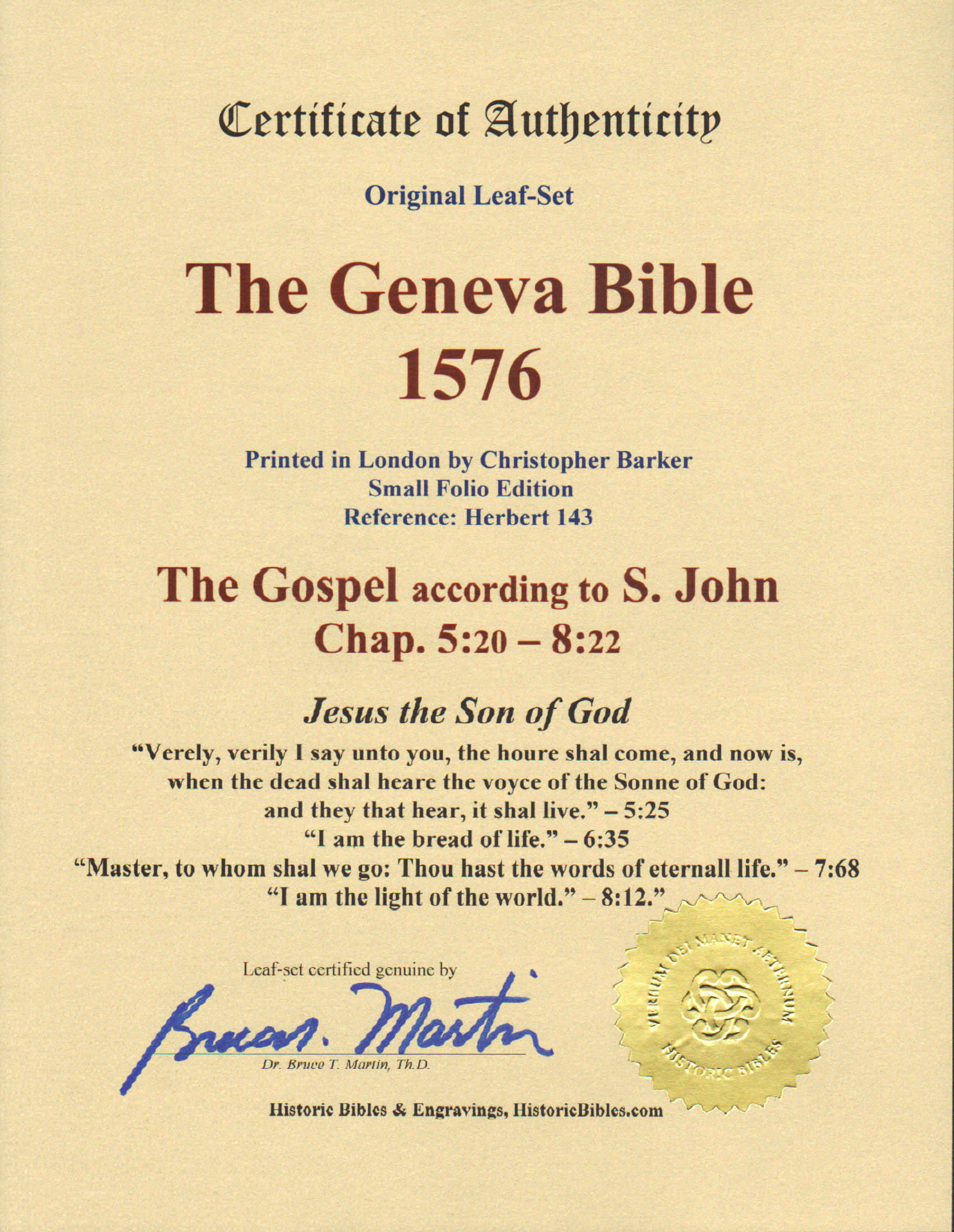 JOHN 5:20-8:22. 2 Leaf-set. “Jesus the Son of God”. Geneva Bible. Printed in London by Christopher Barker, 1576. First folio printed in England, 10.15″ x 6.75″ w. copious marginal notes from a Reformed perspective. Roman type. Reference: Herbert 143. FINE condition overall. Thin stain and small tears to upper edge, light stains to outer corners (see pics). COA on premium “gold leaf” paper w. gold seal. Text bears the meaning of Jesus as the Son of God as a matter of death and life, and includes two “I am” sayings (6:35; 8:12). Leaf-set sets in a Bifold Portfolio, the COA in a separate Archival Booklet.
