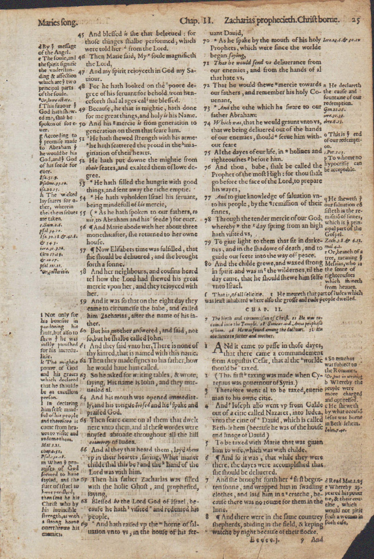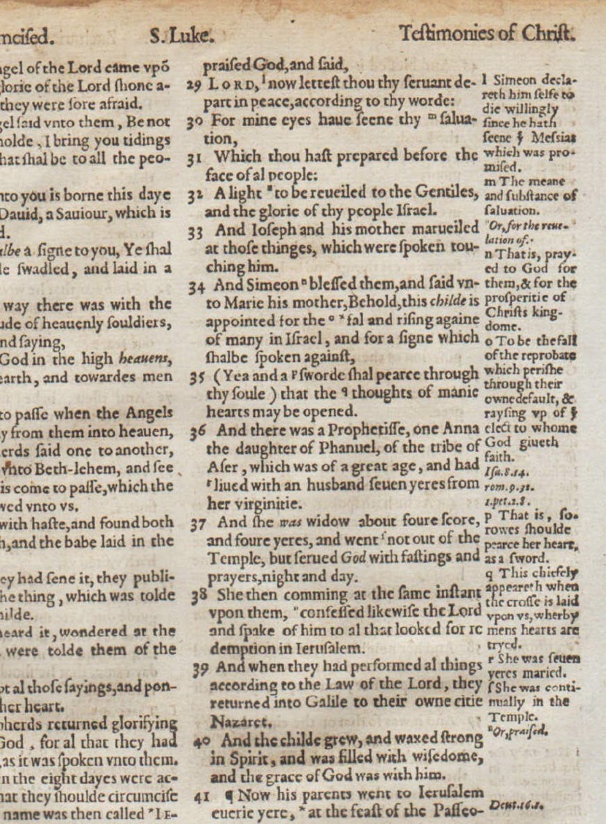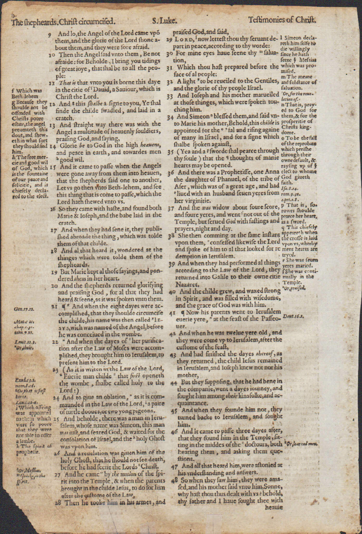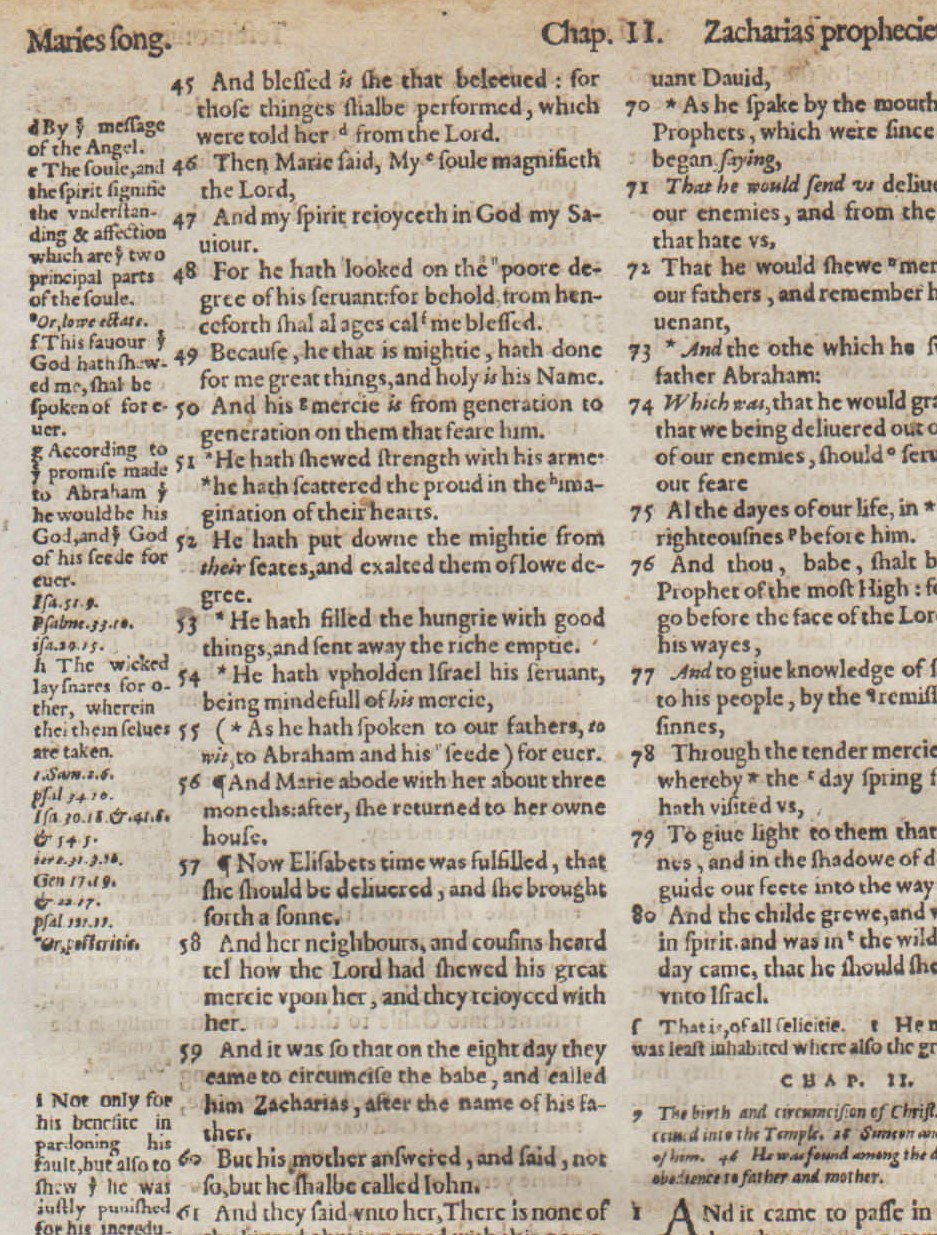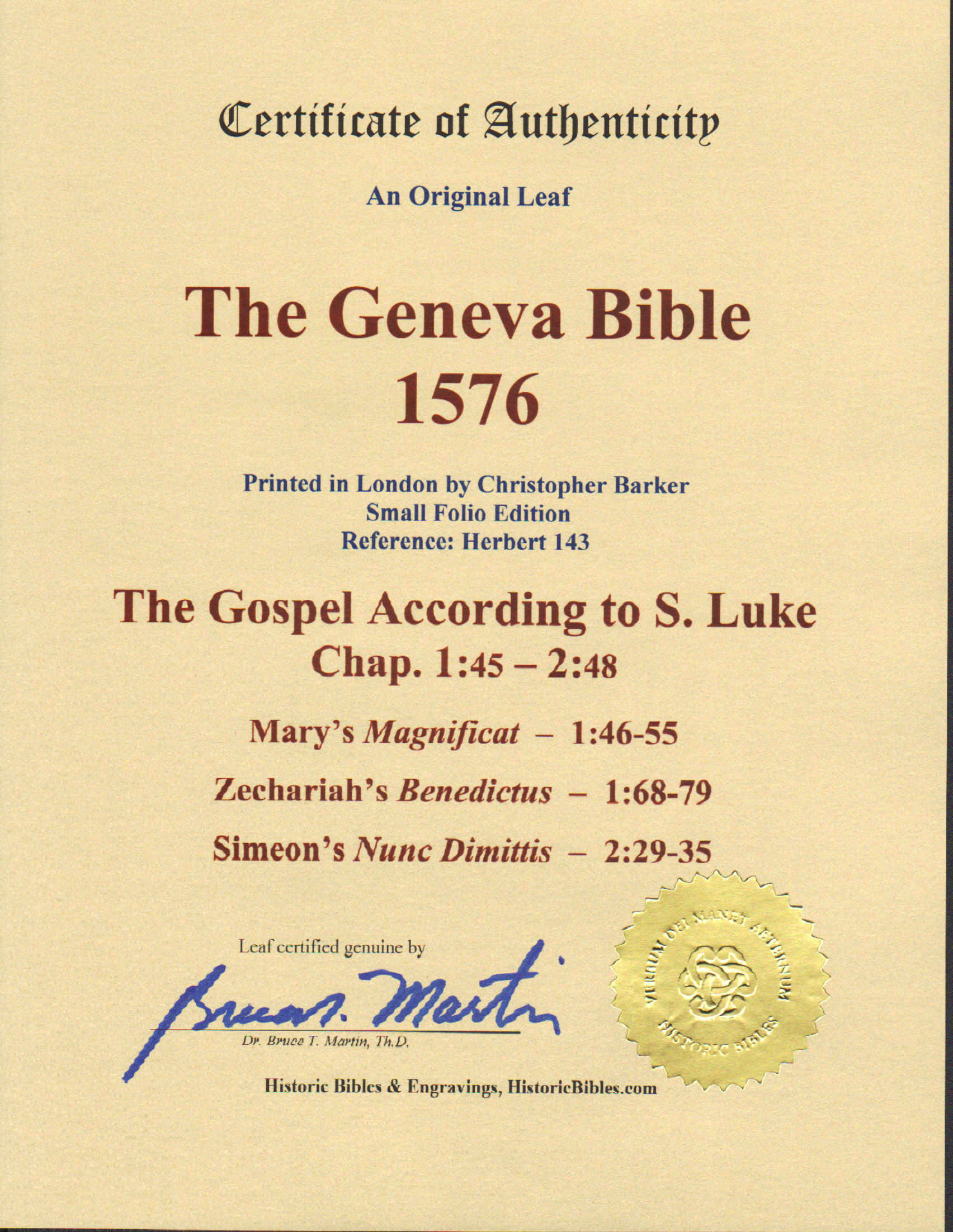 LUKE 1:45-2:48. “Magnificat!” (1:46-55). Geneva Bible. Printed in London by Christopher Barker, 1576. First folio printed in England, 10.15″ x 6.75″ w. copious marginal notes from a Reformed perspective. Roman type. Reference: Herbert 143. FINE- condition. Light marginal and edge stains (see pics). COA on premium “gold leaf” paper w. gold seal. Text includes the beloved liturgical hymns: Mary’s Magnificat (1:46-55), Zechariah’s Benedictus (1:68-79), and Simeon’s Nunc Dimittis (2:29-35). A fantastic leaf, despite its faults.