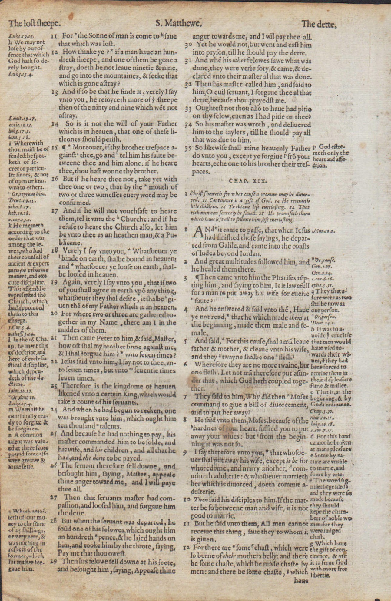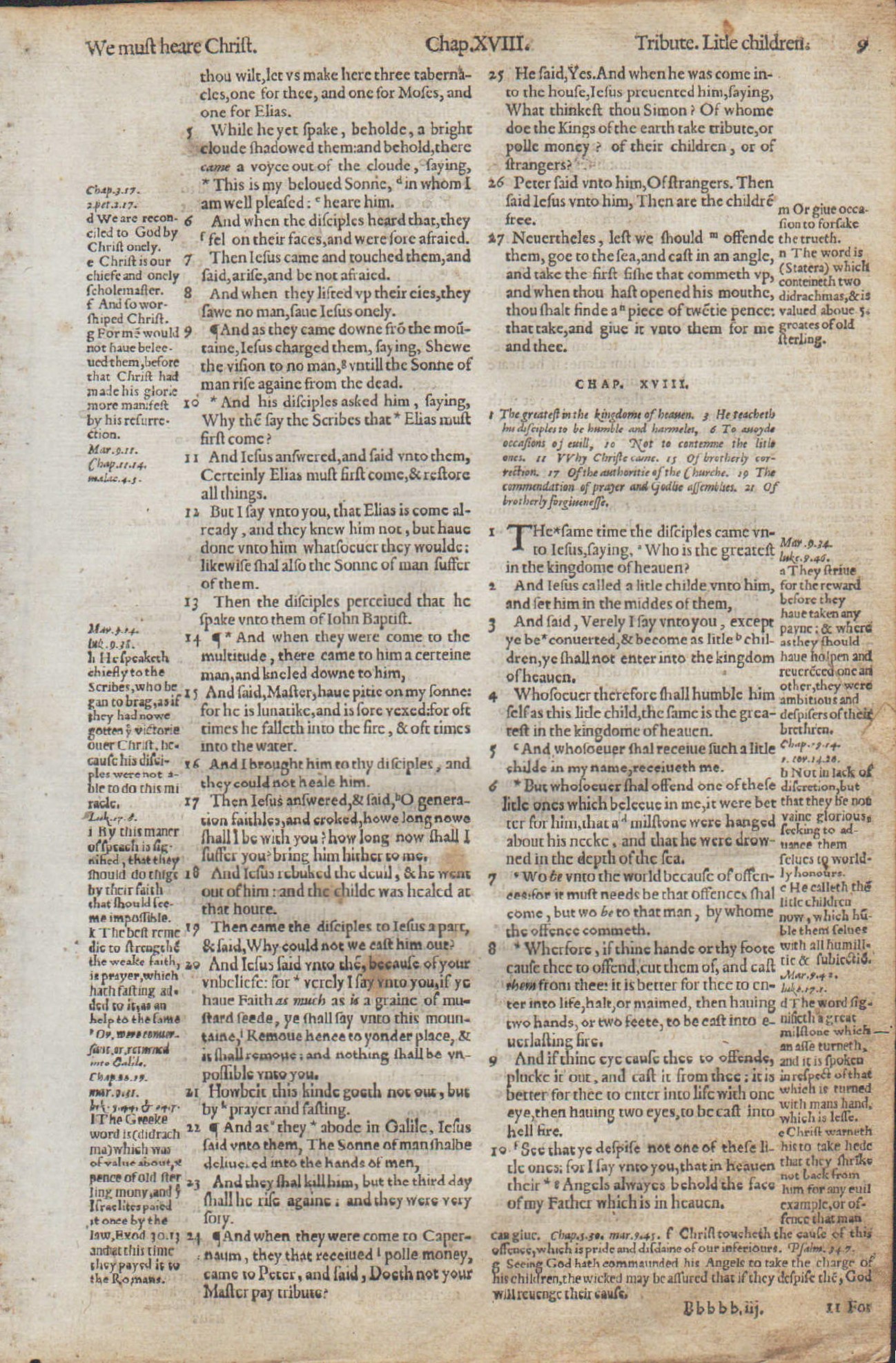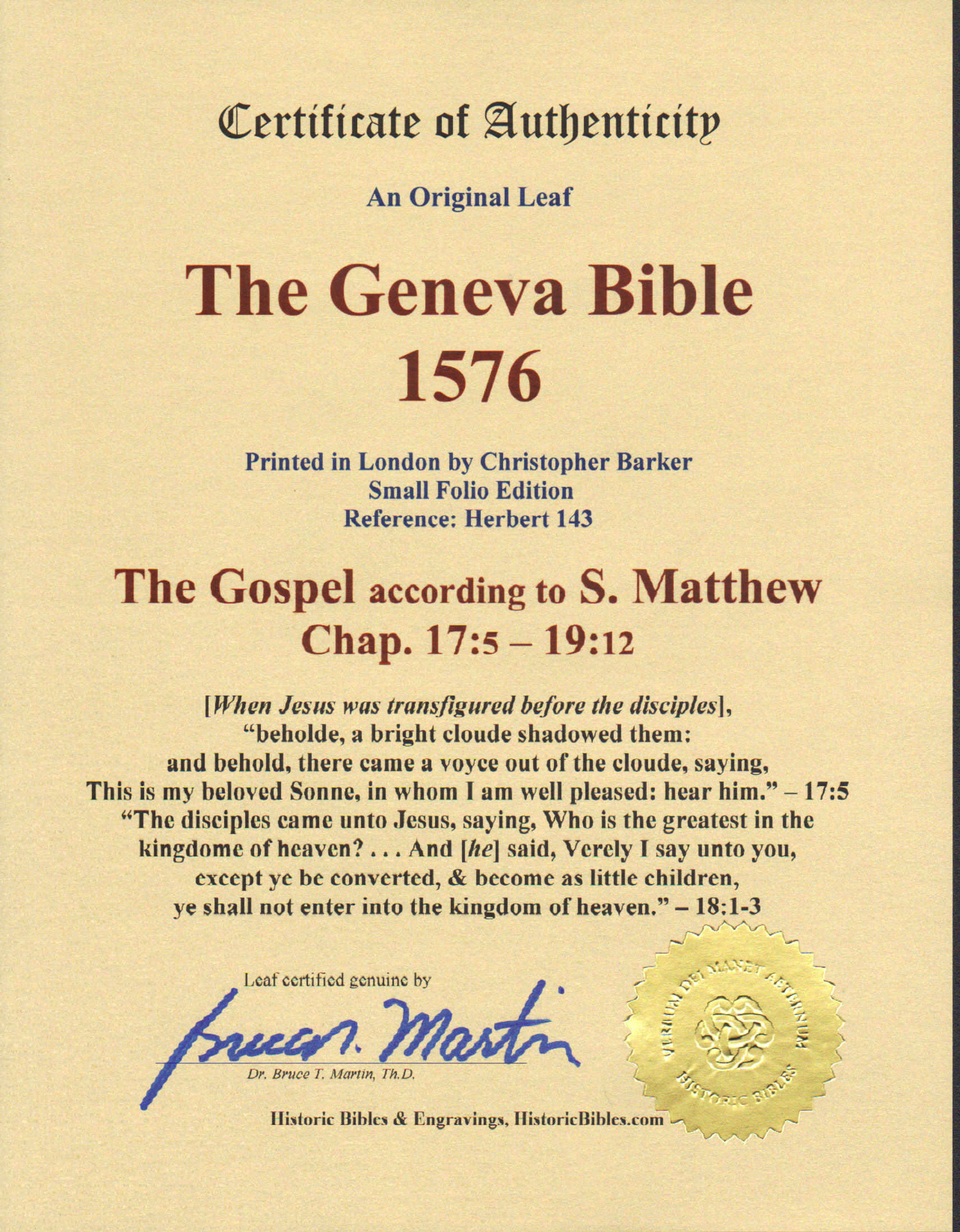 MATTHEW 17:5-19:12. “Transfiguration”. Printed in London by Christopher Barker. First folio edition printed in England. Herbert 143. 10″ x 6.75″. FINE condition. Light stain to outside corner and upper edge (see pic). Text includes not only the stunning end to Jesus’ Transfiguration, but the popular episode about becoming as children in order to enter the kingdom of God.