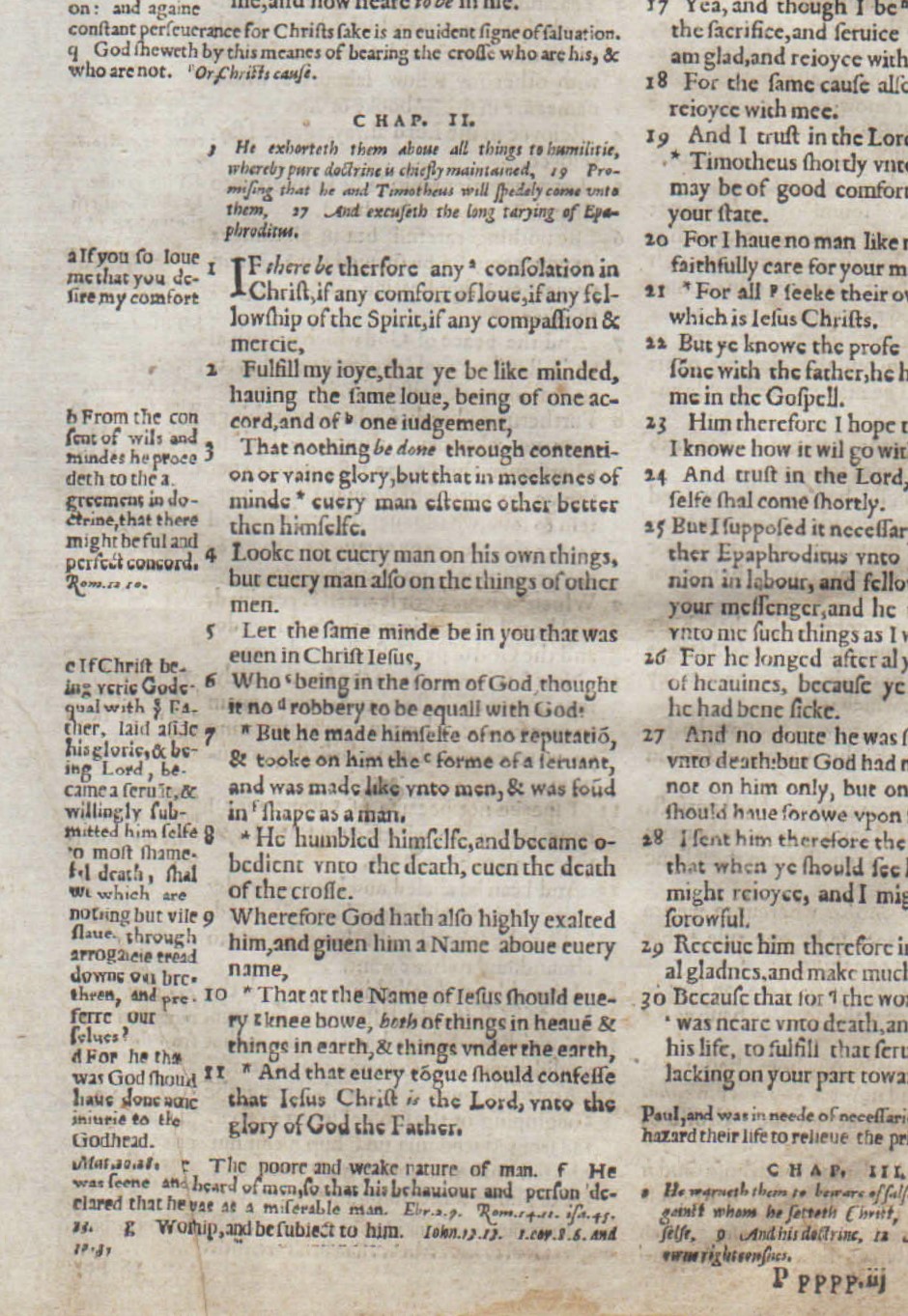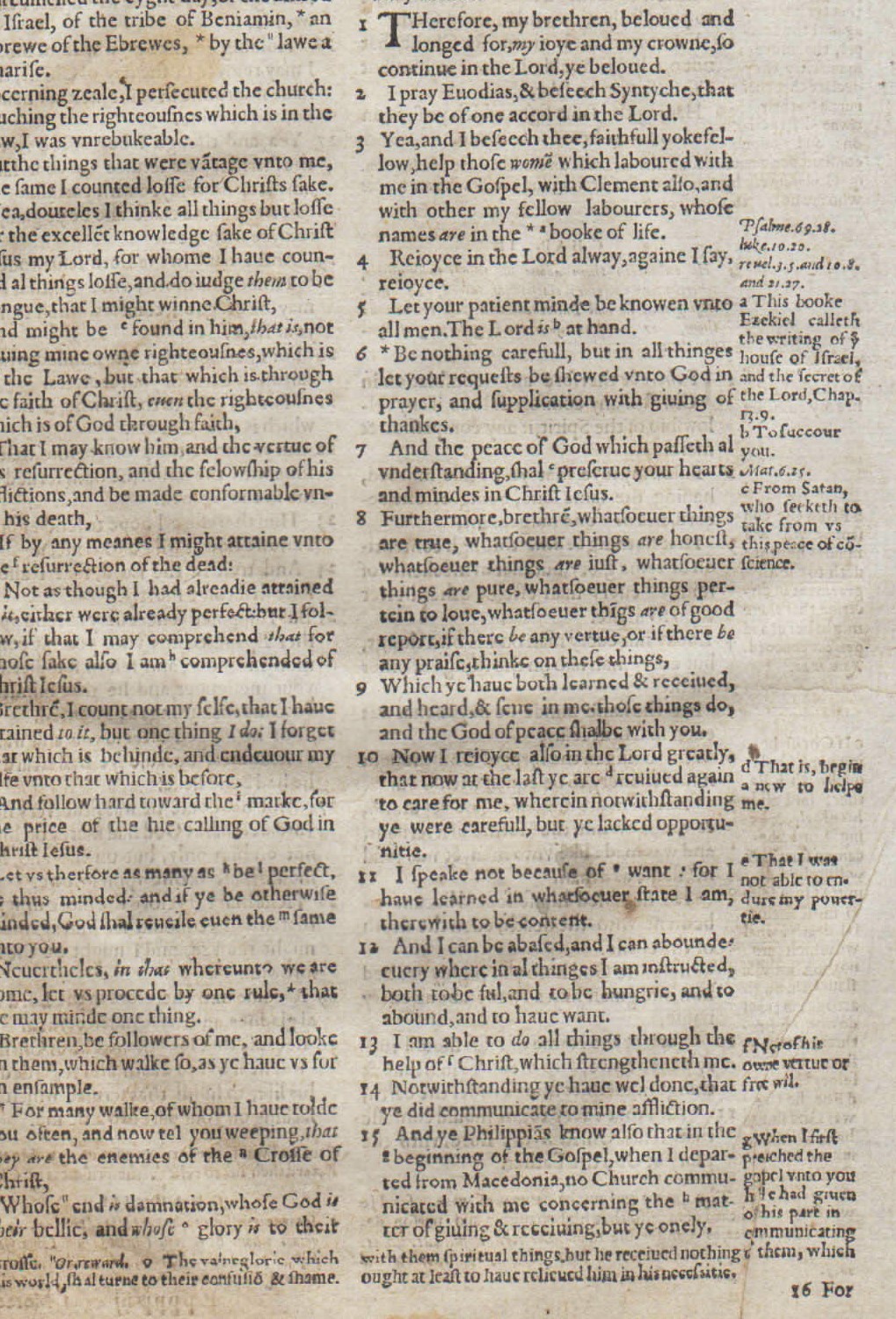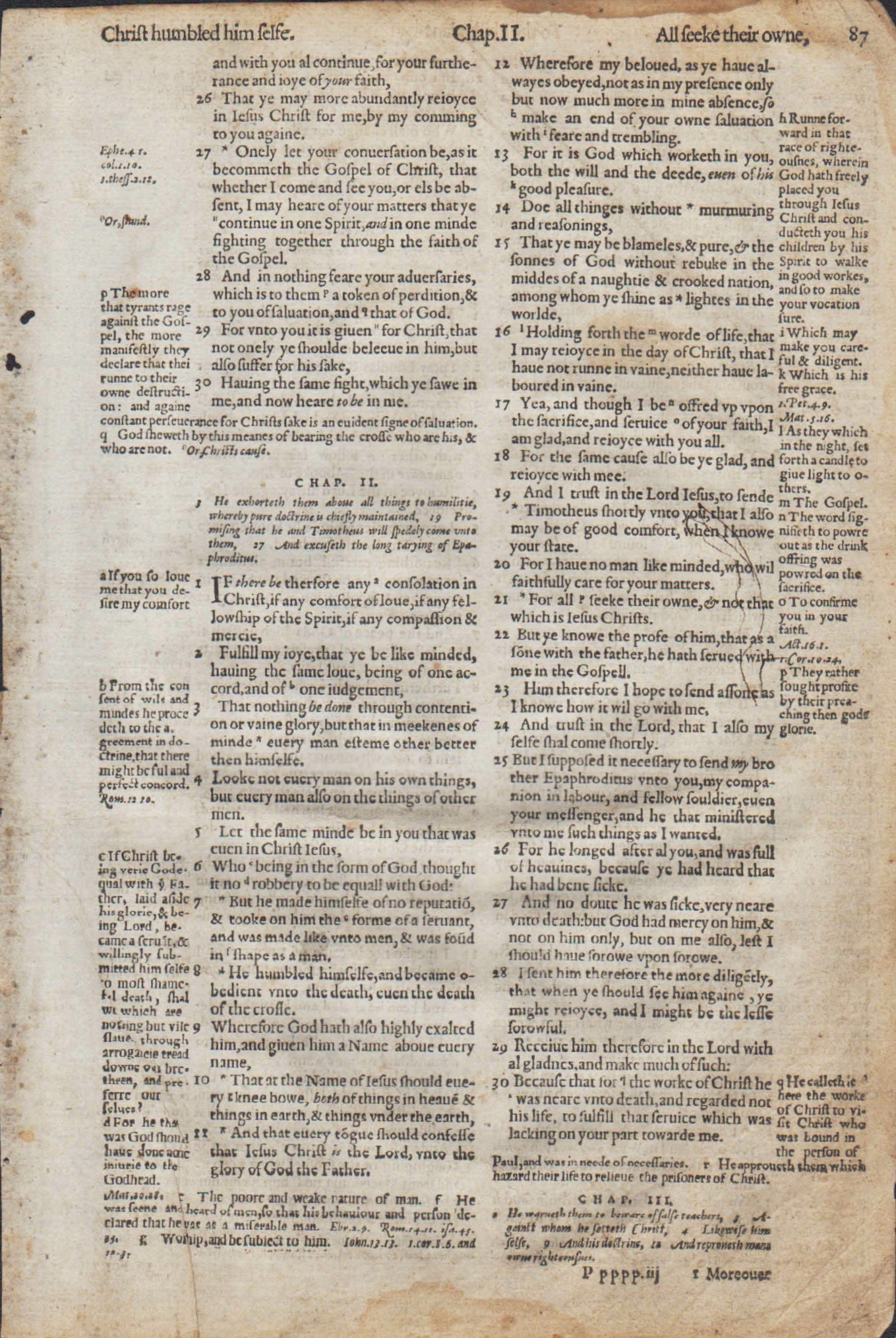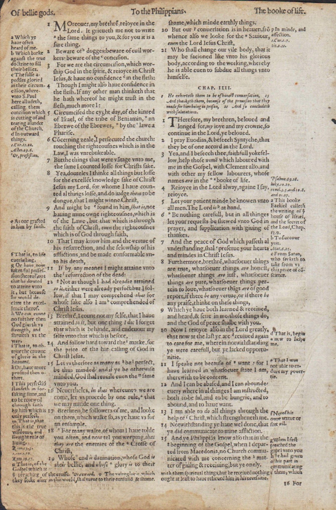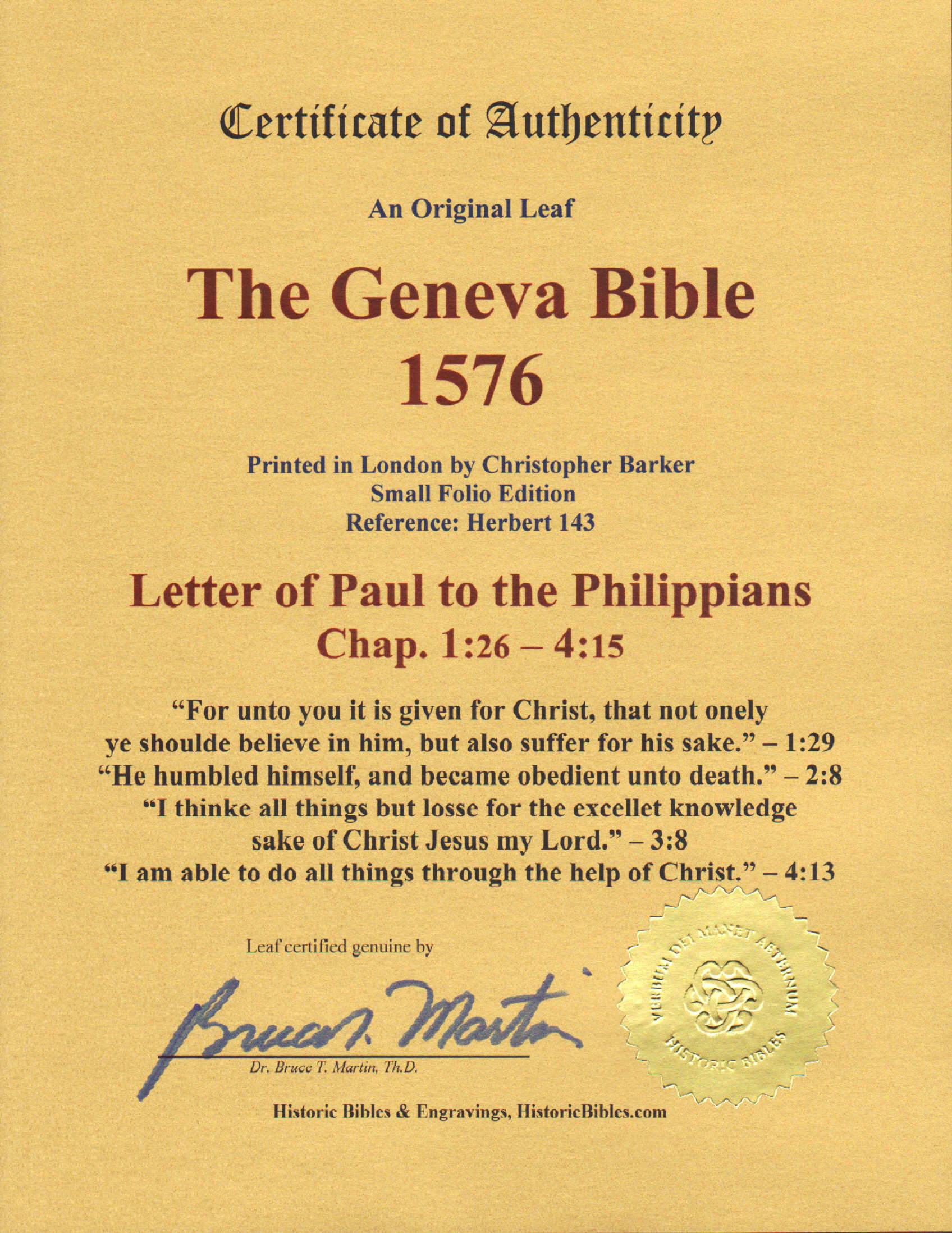 PHILIPPIANS 1:26-4:15. “Humility and Faith”. Geneva Bible. Printed in London by Christopher Barker, 1576. First folio printed in England, 10.15″ x 6.75″ w. copious marginal notes from a Reformed perspective. Roman type. Reference: Herbert 143. FINE- condition. Marginal and edge stains (see pics). COA on premium “gold leaf” paper w. gold seal. Text: the relationship between suffering (humility) and faith-in-Christ, as exemplified in the Christ-hymn at 2:5-11. The wildly popular verse 4:13 should be read in this context.