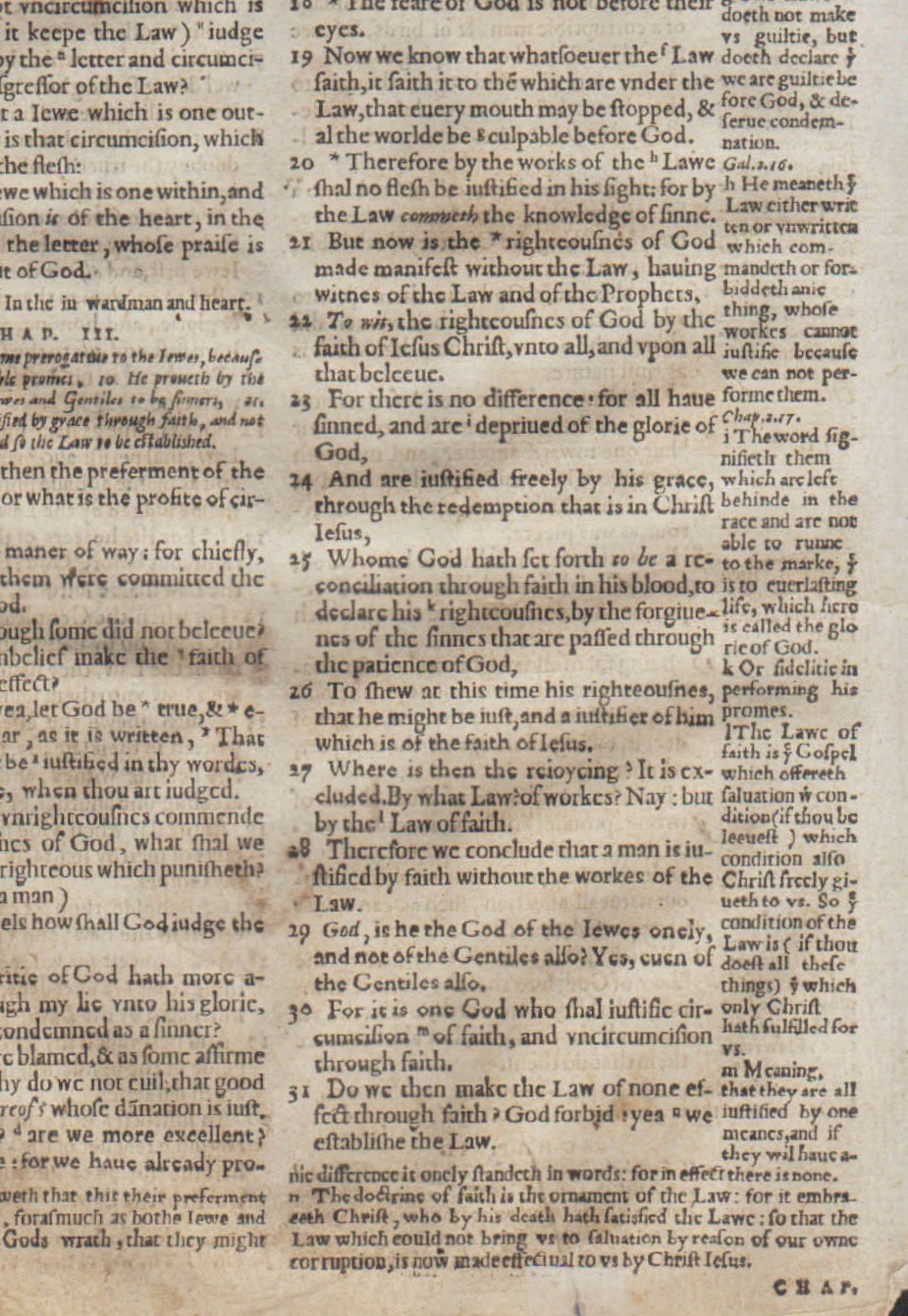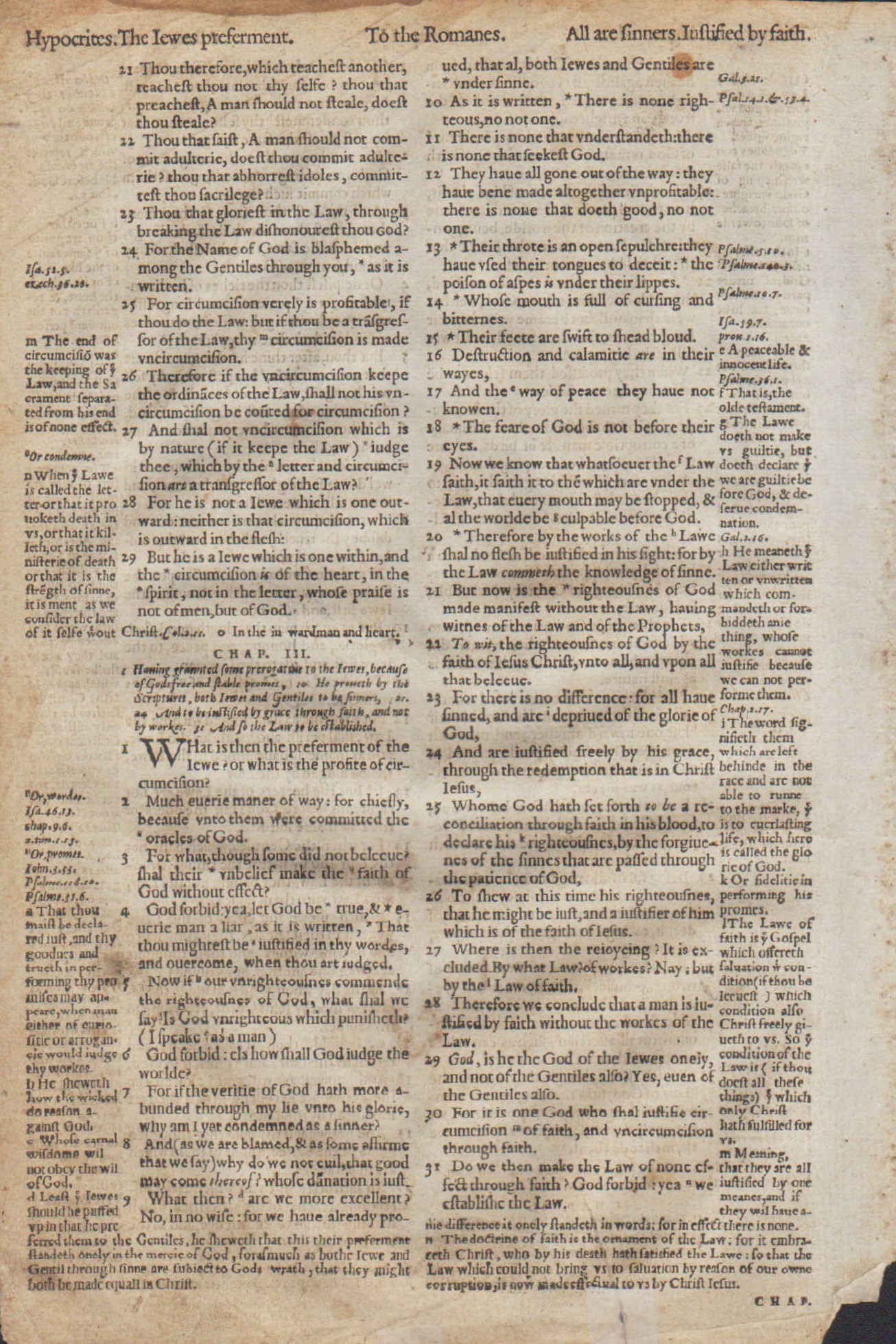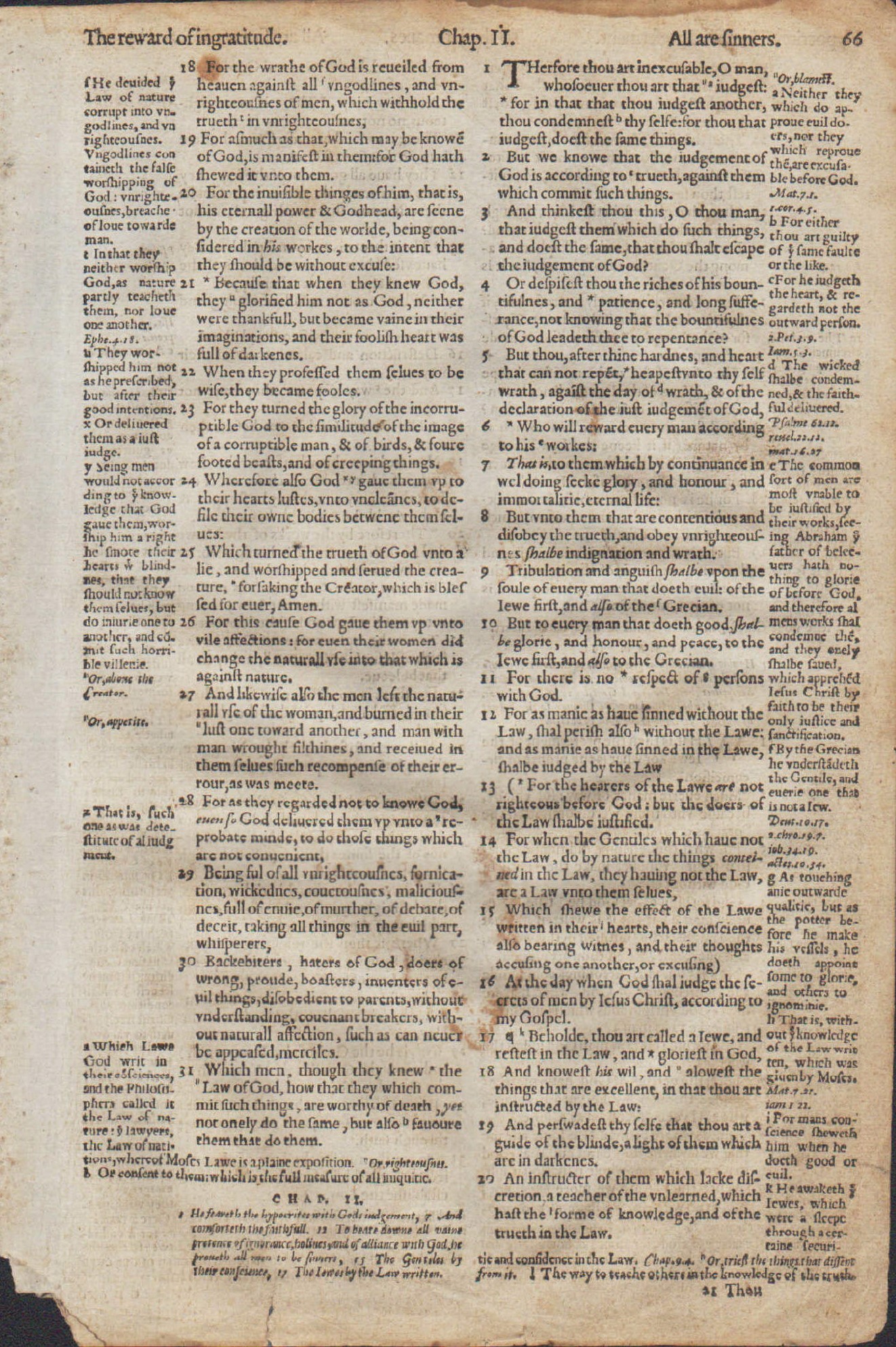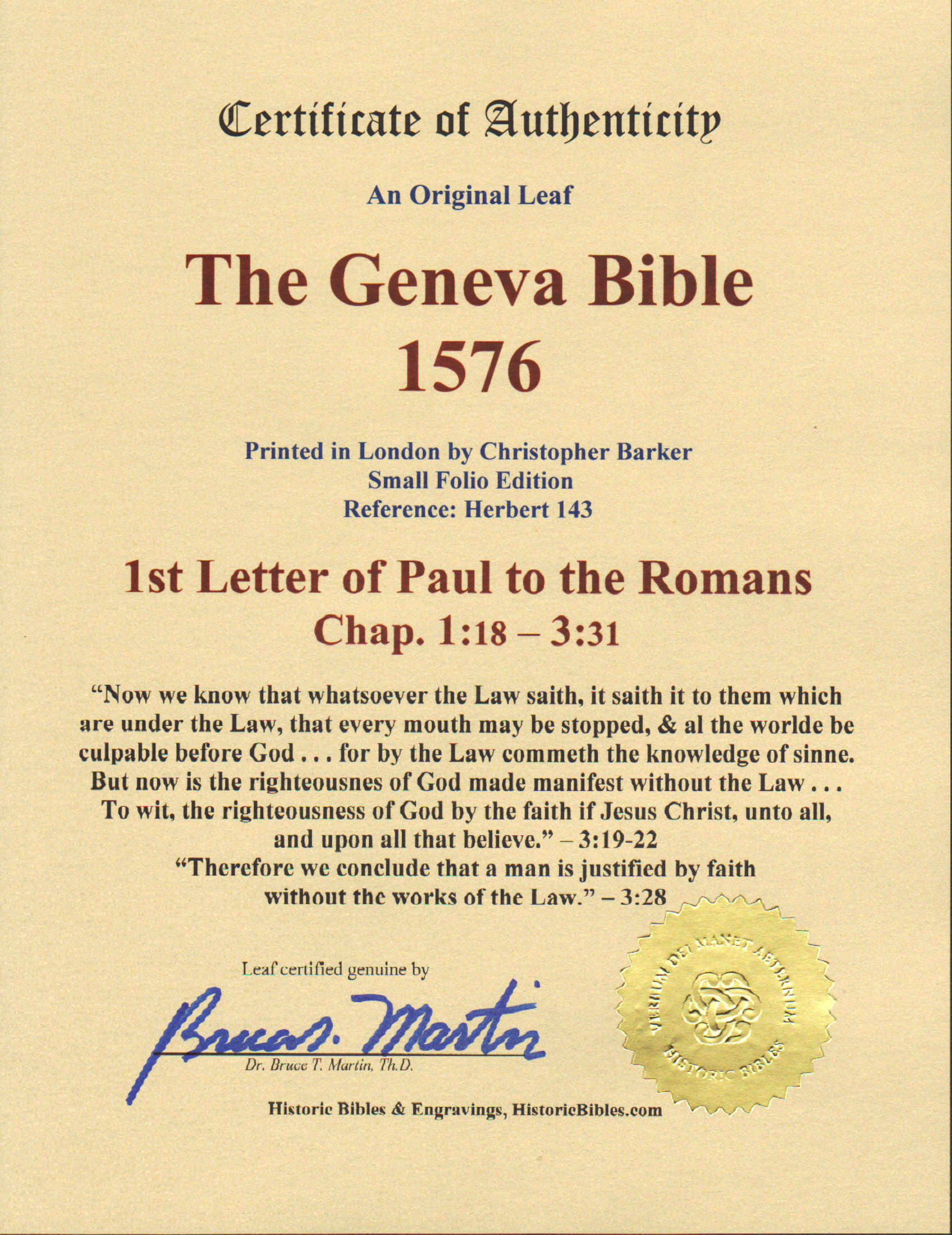 ROMANS 1:18-3:31. “The righteousness of God”. Printed in London by Christopher Barker. First folio edition printed in England. Herbert 143. 10″ x 6.75″. FINE- condition. Stain to upper edge, torn and folded lower inner corner without loss of text or notes, repaired closed tear to bottom margin (see pic); pin holes to lower corner. Text from Paul’s most celebrated letter recalls the function of the Law and the purpose of Christ, namely, to display God’s righteousness.