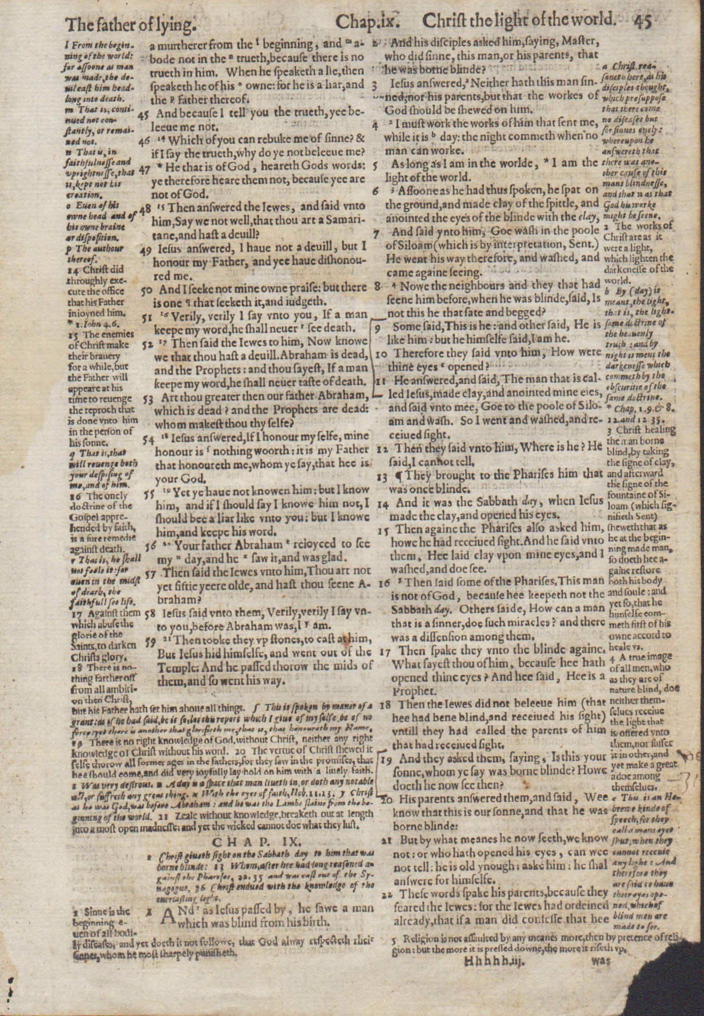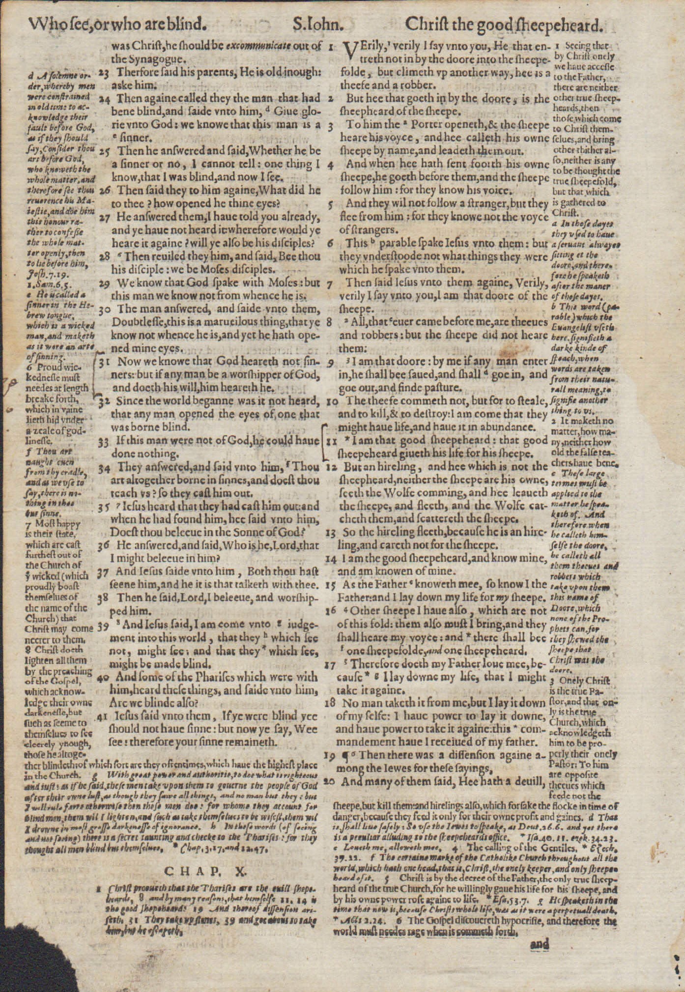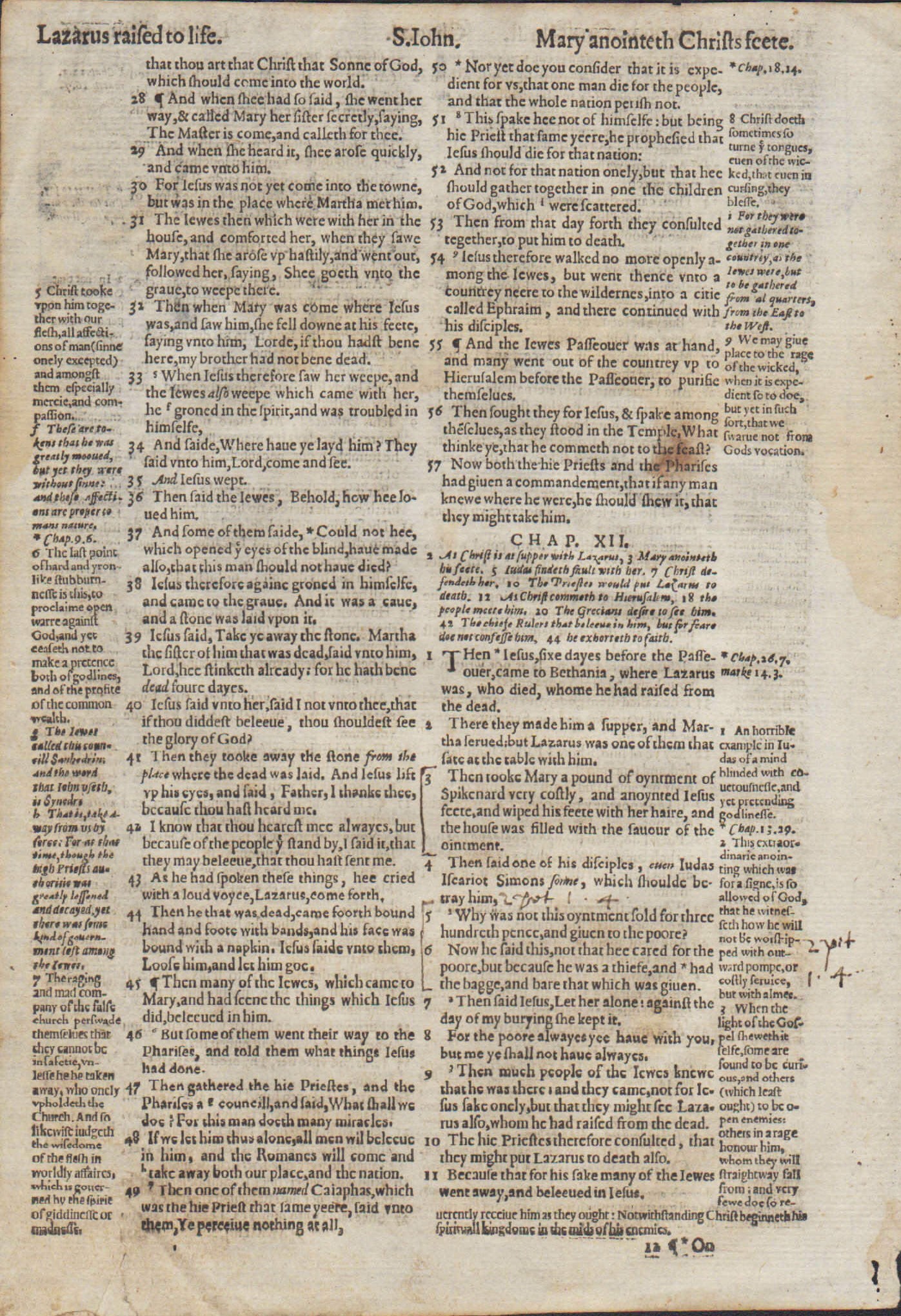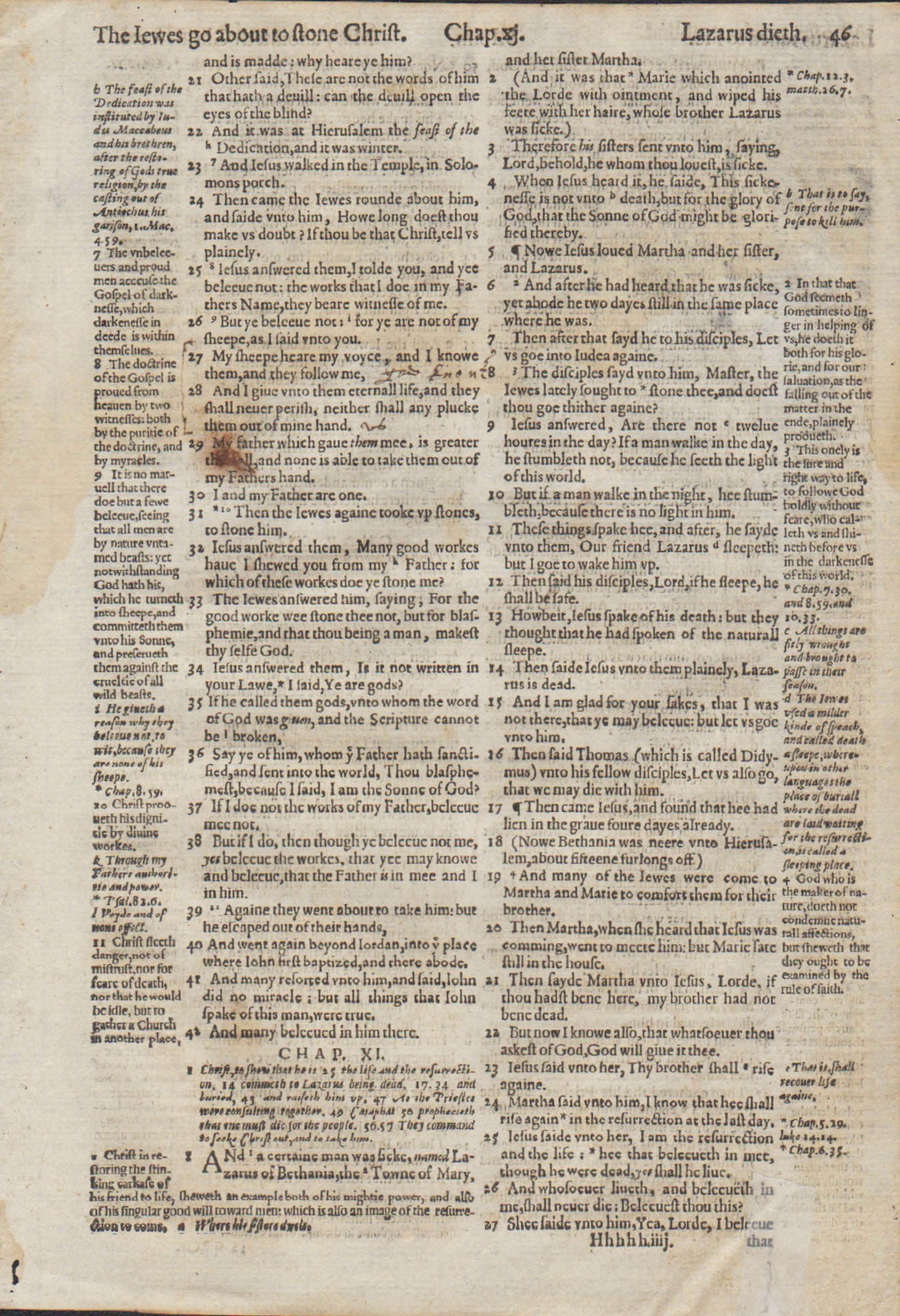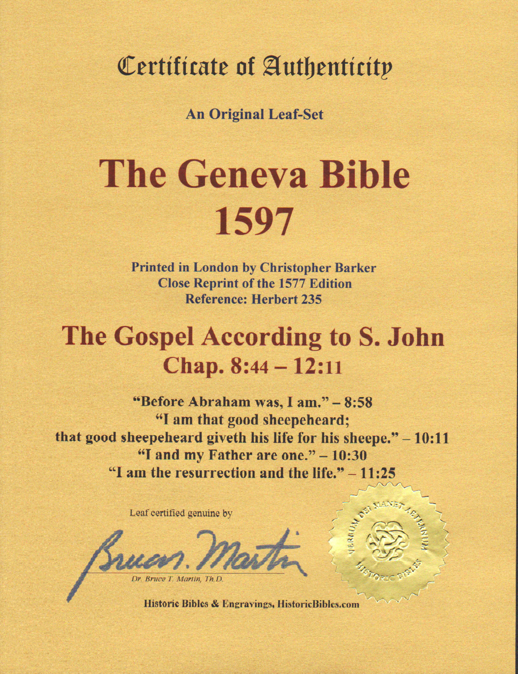 JOHN 8:44-12:11. 2-leaf Set. “I AM”. Geneva Bible. Printed in London by Christopher Barker, 1597. Sm. folio, 10.15″ x 7.0″, reprint of the 1577 ed., Roman type. Reference: Herbert 235. Two leaves in set: 8:44-10:20 and 10:21-12:11. GOOD+ condition overall. 1st leaf: moderate stains, torn away lower corner without loss of text or notes (see pics). 2nd leaf: moderate stains, single blotch at 10:29, repaired closed tear at lower margin without loss (see pics). Older marginal brackets and notes in pen. COA on premium “gold leaf” paper w. gold seal. The two leaves in this set are placed in an Archival Booklet, as is the COA. Text includes some of the remarkable “I AM” sayings of Jesus, at 8:58, 10:11, 10:30, and 11:25. A terrific leaf-set, with admittedly marginal leaves.