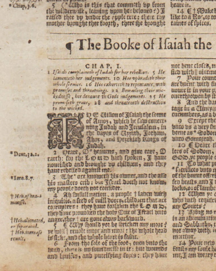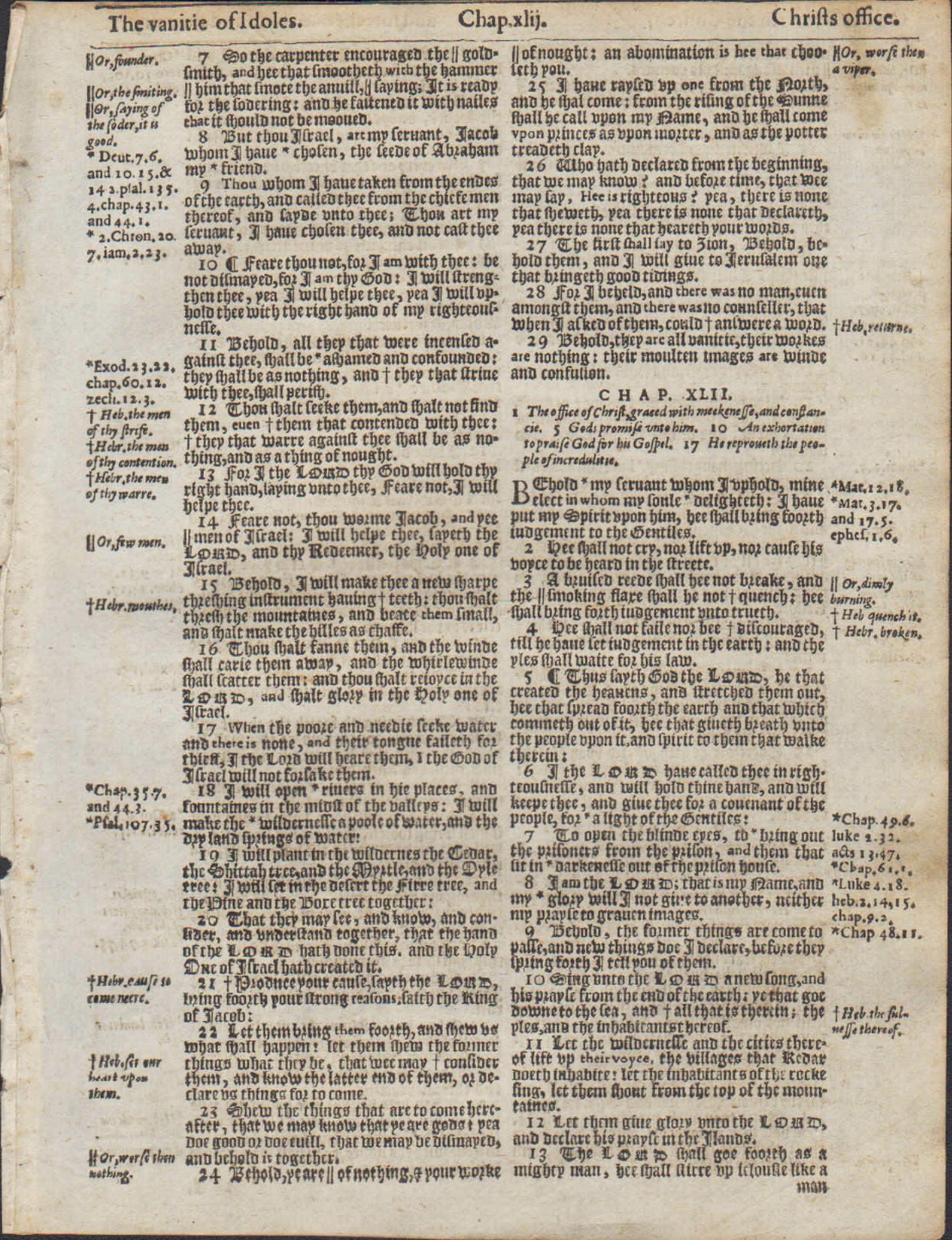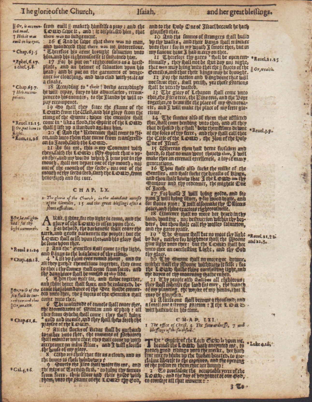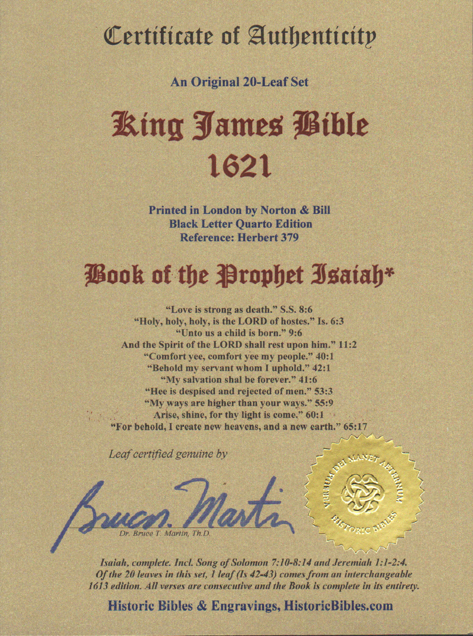 NOTE: Although the Isaiah text is complete, 19 of the 20 leaves come from a 1621 Bible and one leaf (Ch 42-43) comes from an interchangeable text 1613 Bible of the same size and text type (Gothic or Black Letter). All verses are continuous among all leaves and the Book is complete in its entirely.