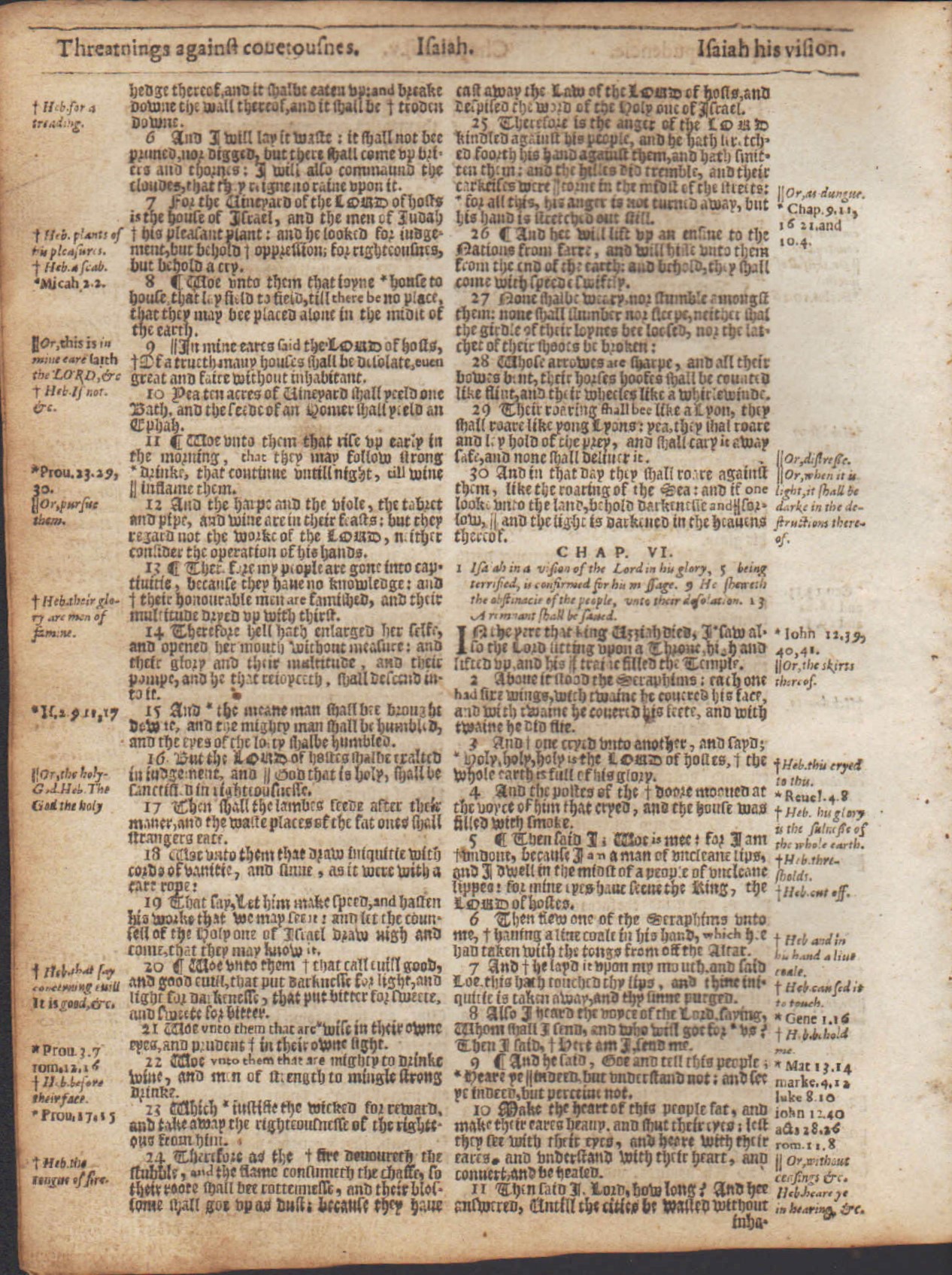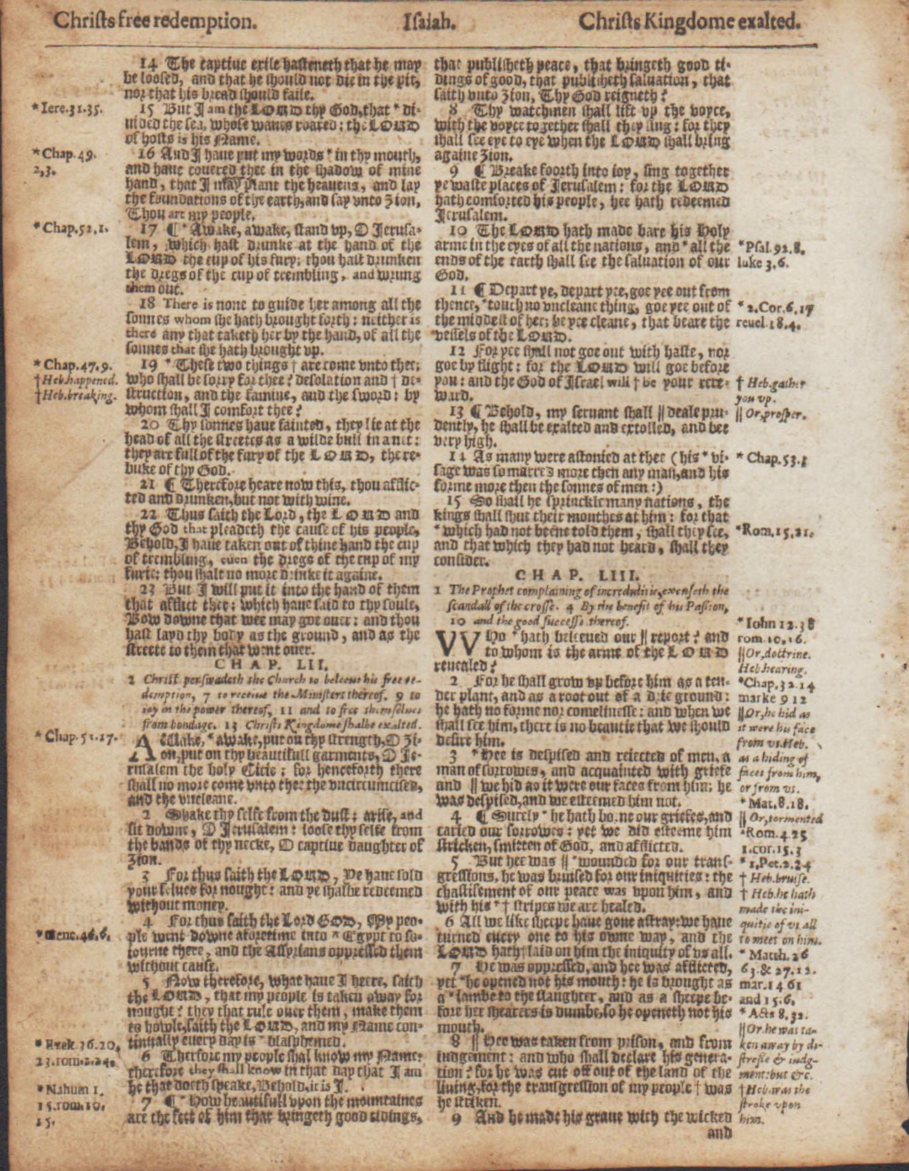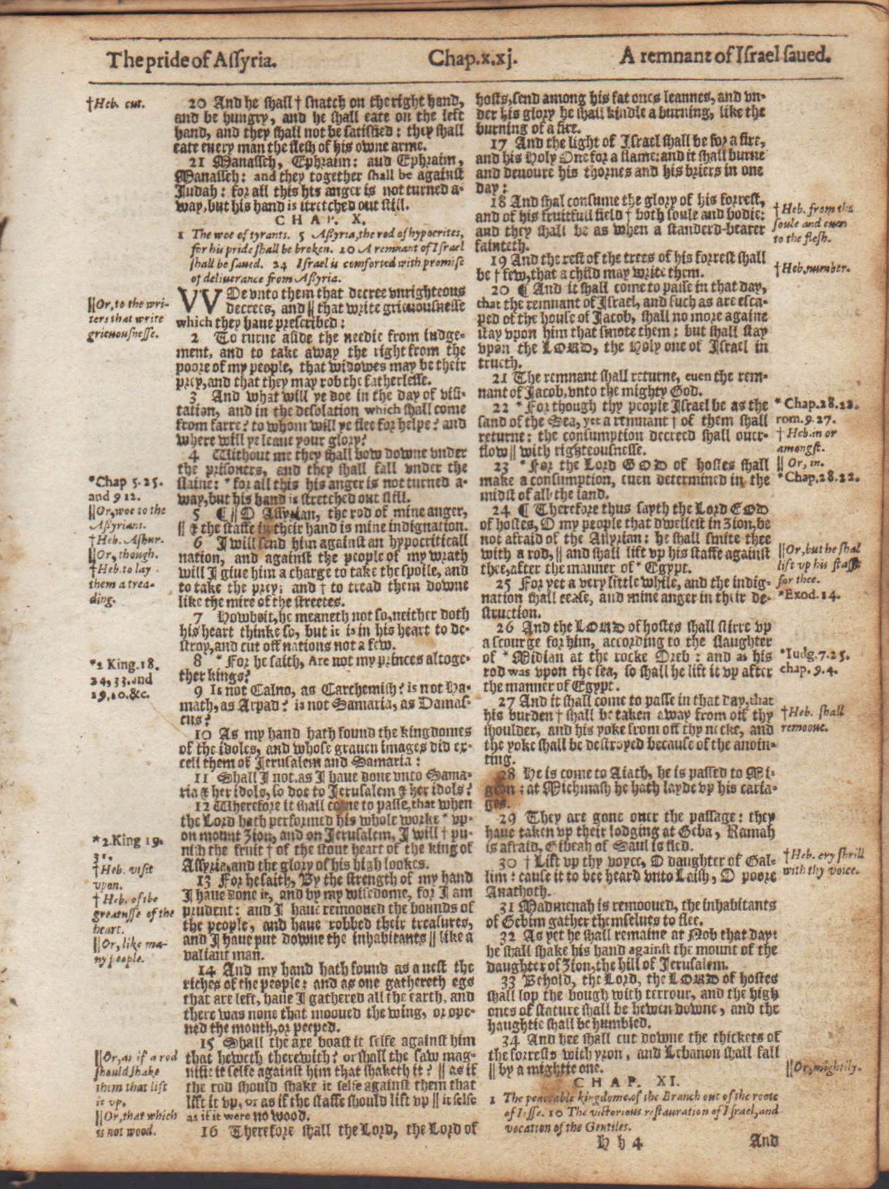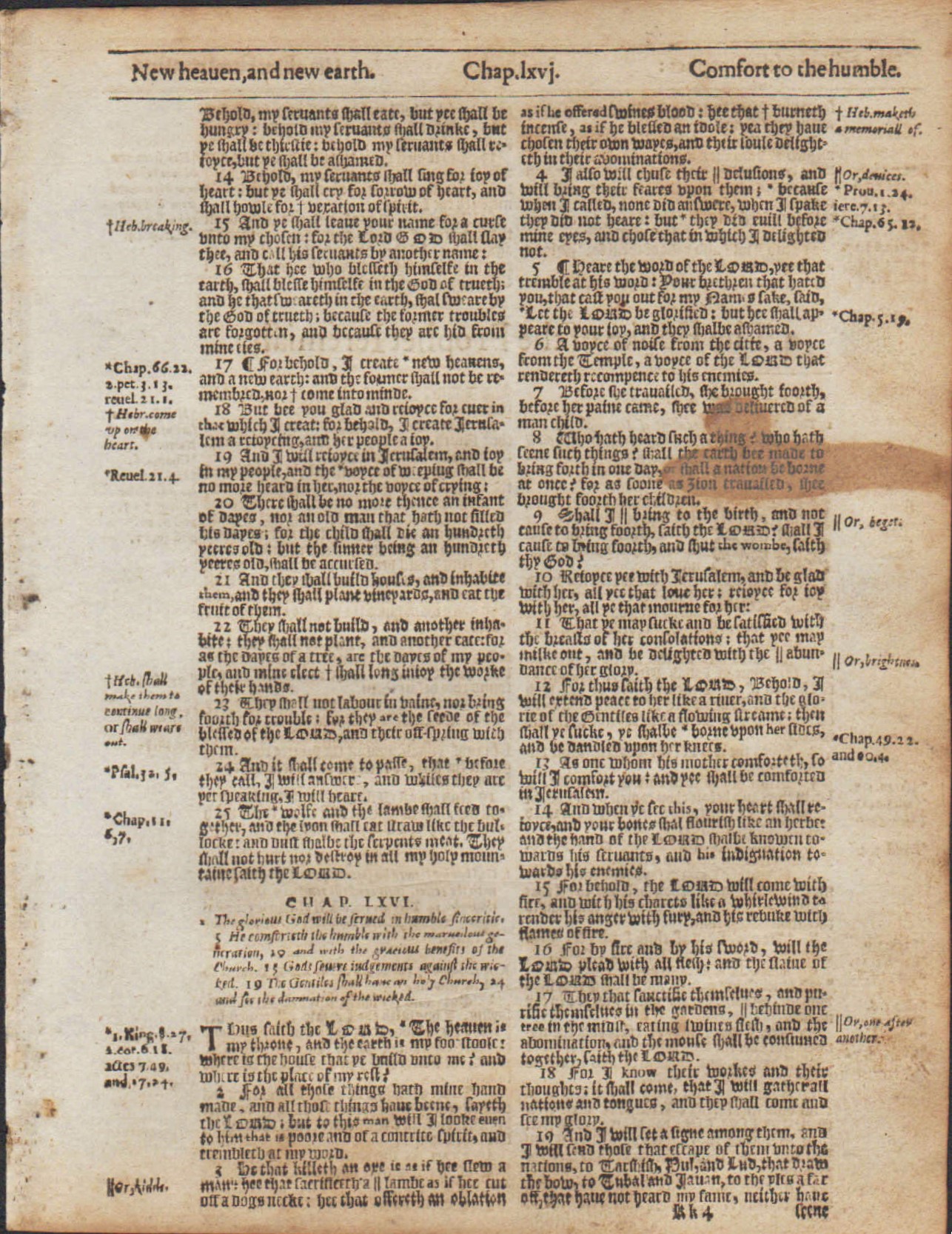 NOTE: Although the Isaiah text is complete, 19 of the 20 leaves come from a 1621 Bible and one leaf (Ch 42-43) comes from an interchangeable text 1613 Bible of the same size and text type (Gothic or Black Letter). All verses are continuous among all leaves and the Book is complete in its entirely.