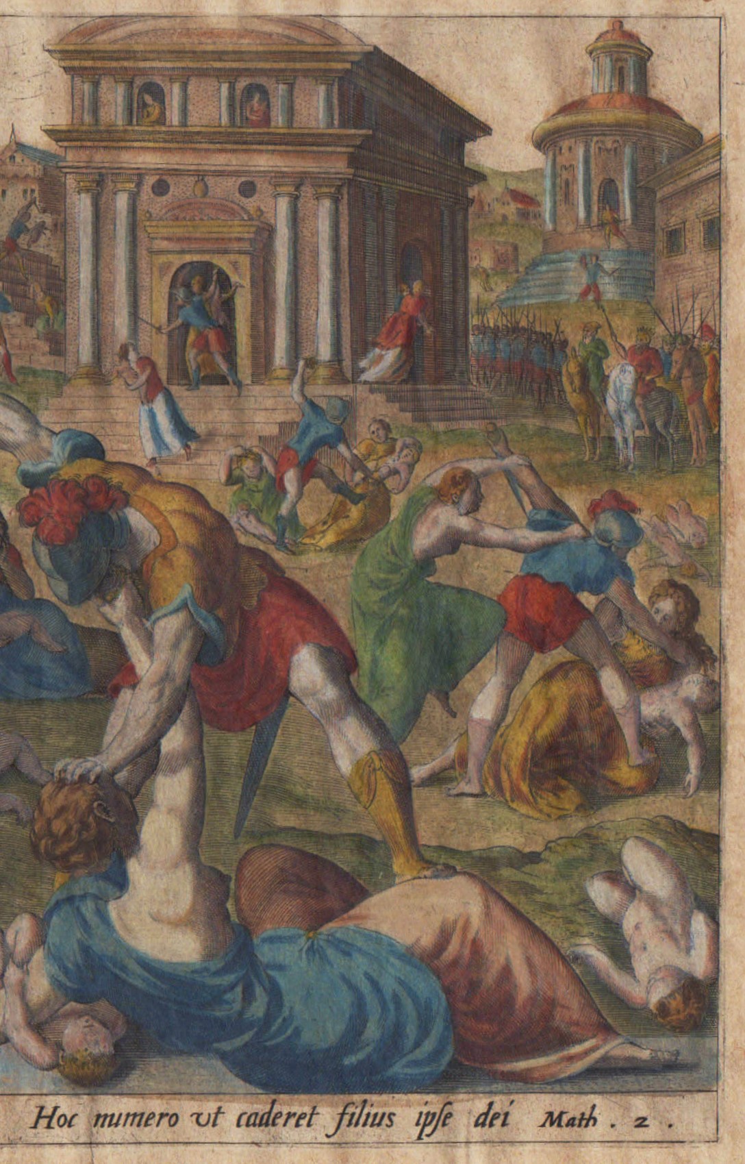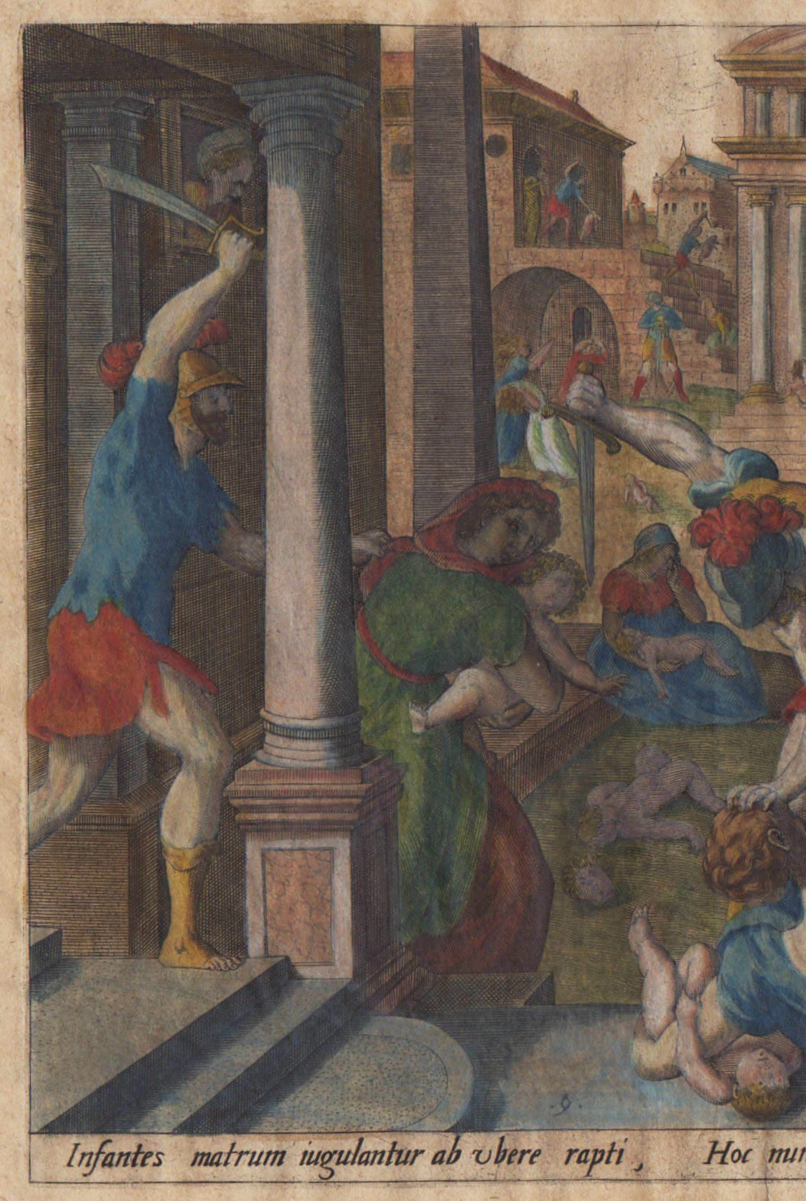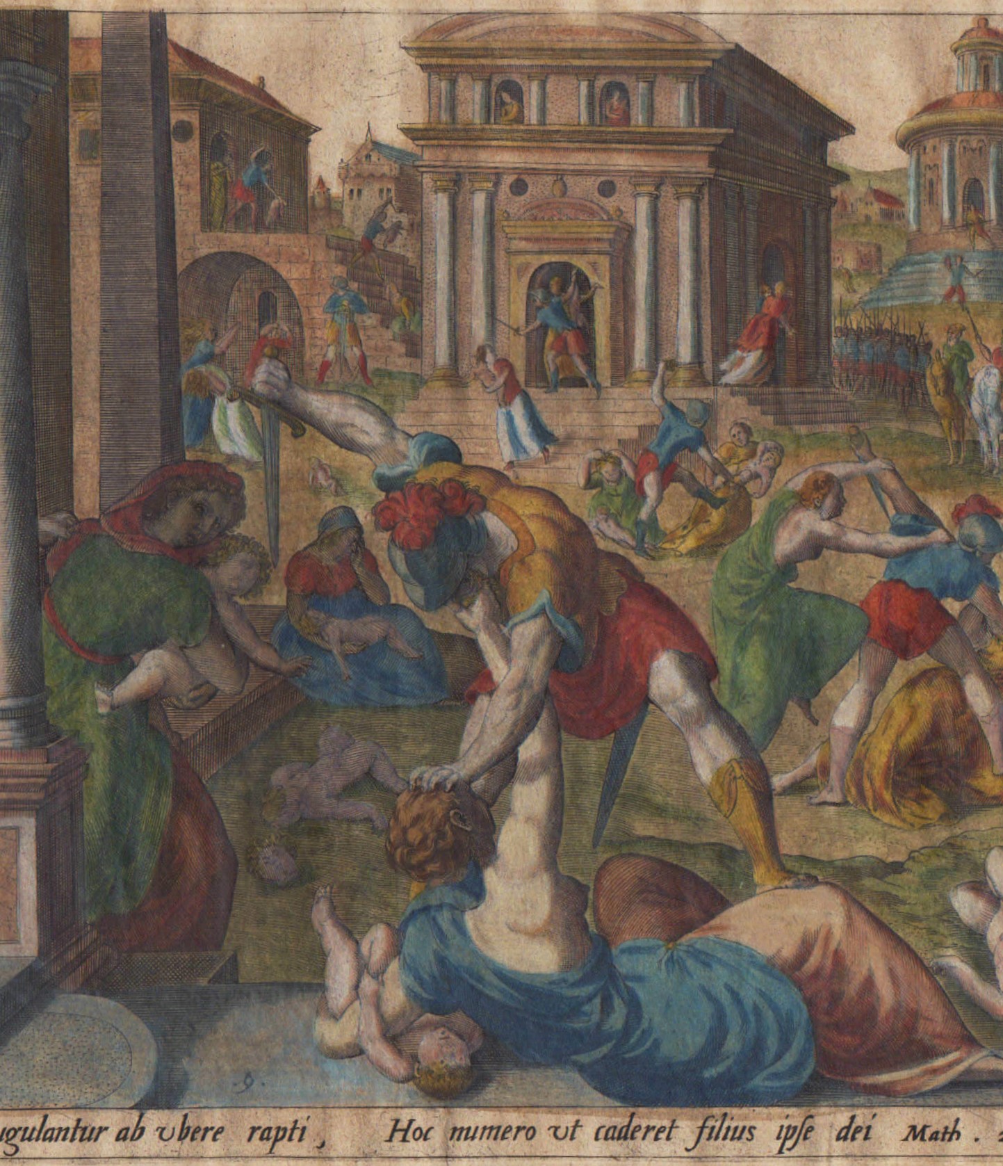Slaughter of the Innocents. Second State, 1585. Richly multi-colored, V. Rare. Plate 9 in the series, “The Childhood of Christ.” New Hollstein 64.2 (Groenning); the first state in 1574 is in the “Youth of Christ” series. Conceptual artist, G. Groenning. Engraver, Jan Sadeler I. Publisher, Gerard de Jode. Uncut engraving on ageing laid paper, 10″ x 8.25″, full margins 13.5″ x 10.75.” Apparent “waviness” in margins (see picture) does not affect the colored plate. This magnificent though violent engraving depicts scenes from Matthew 2, Herod’s attempt to kill the newborn King of the Jews.