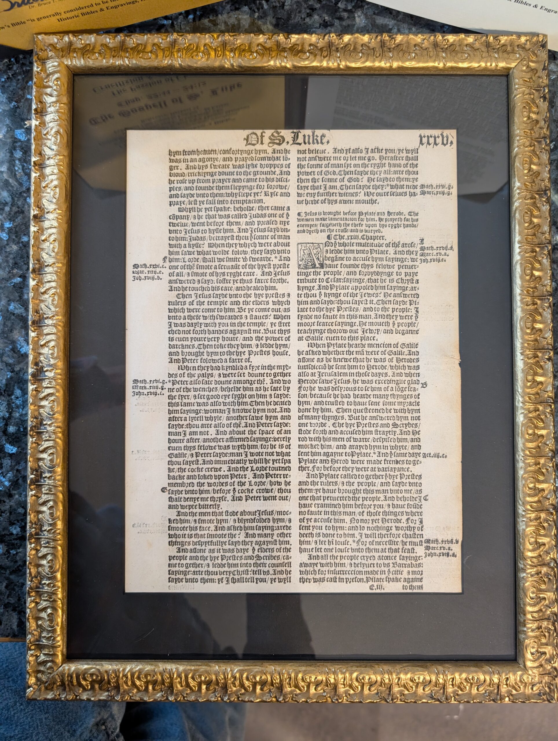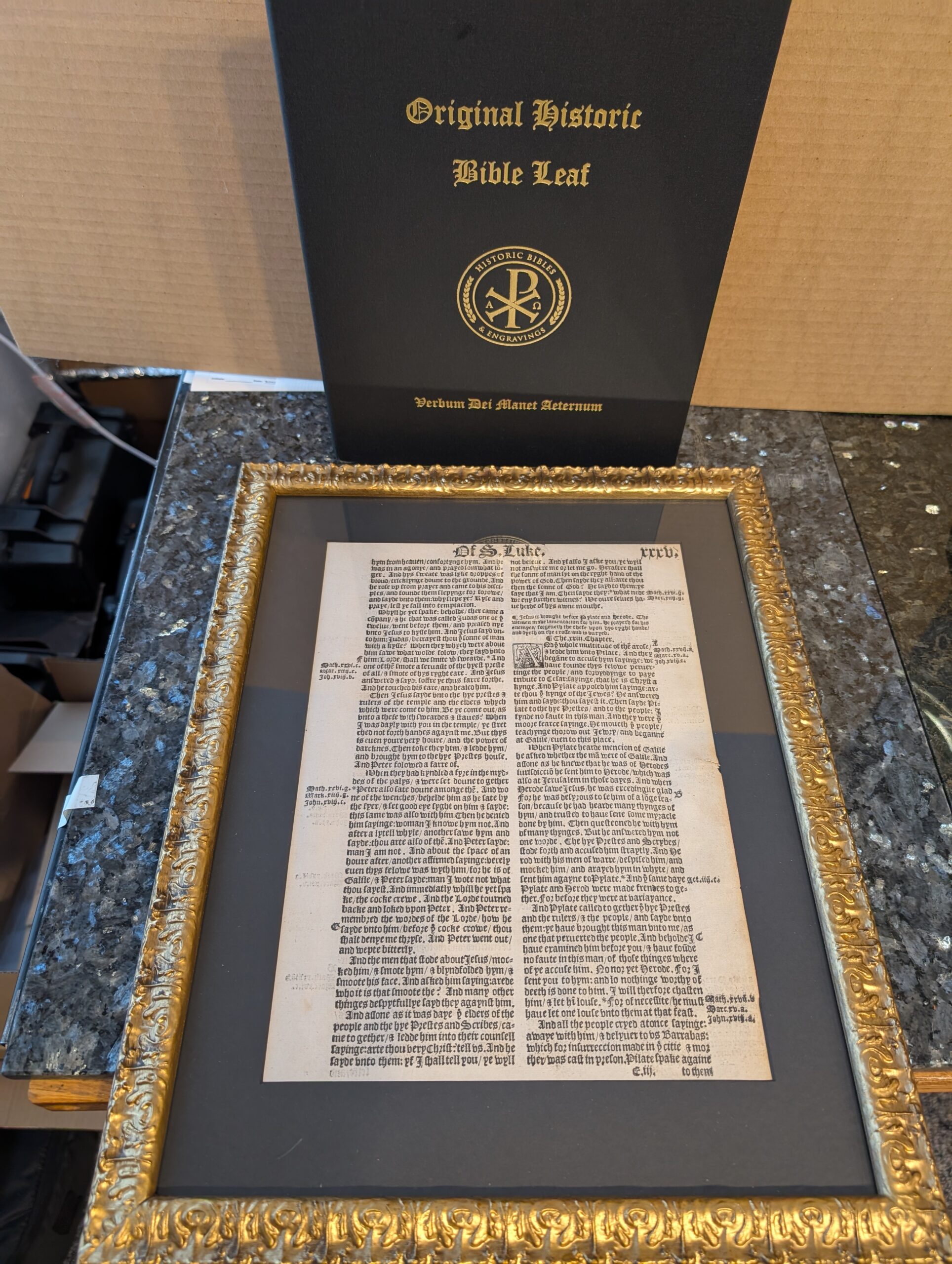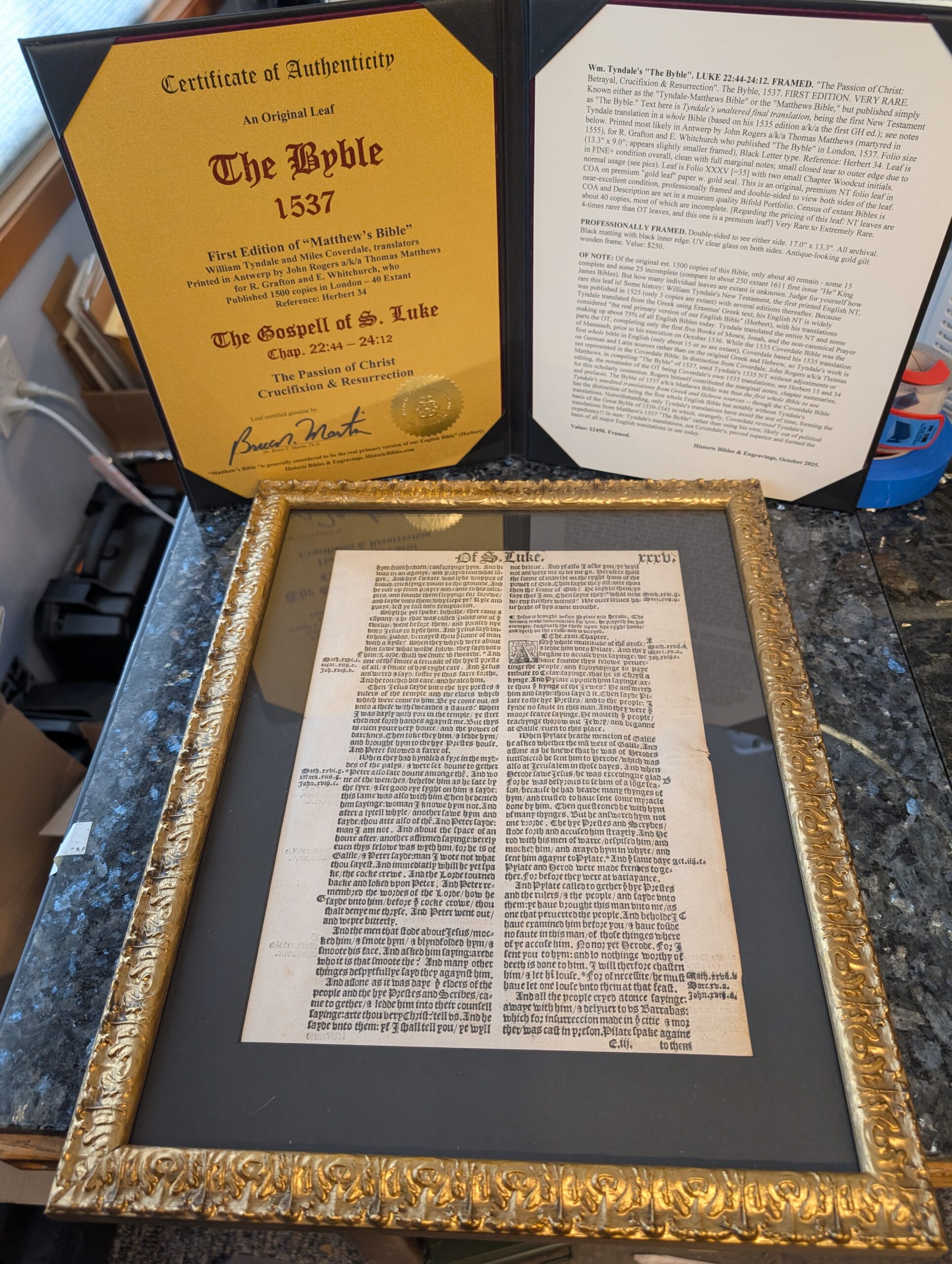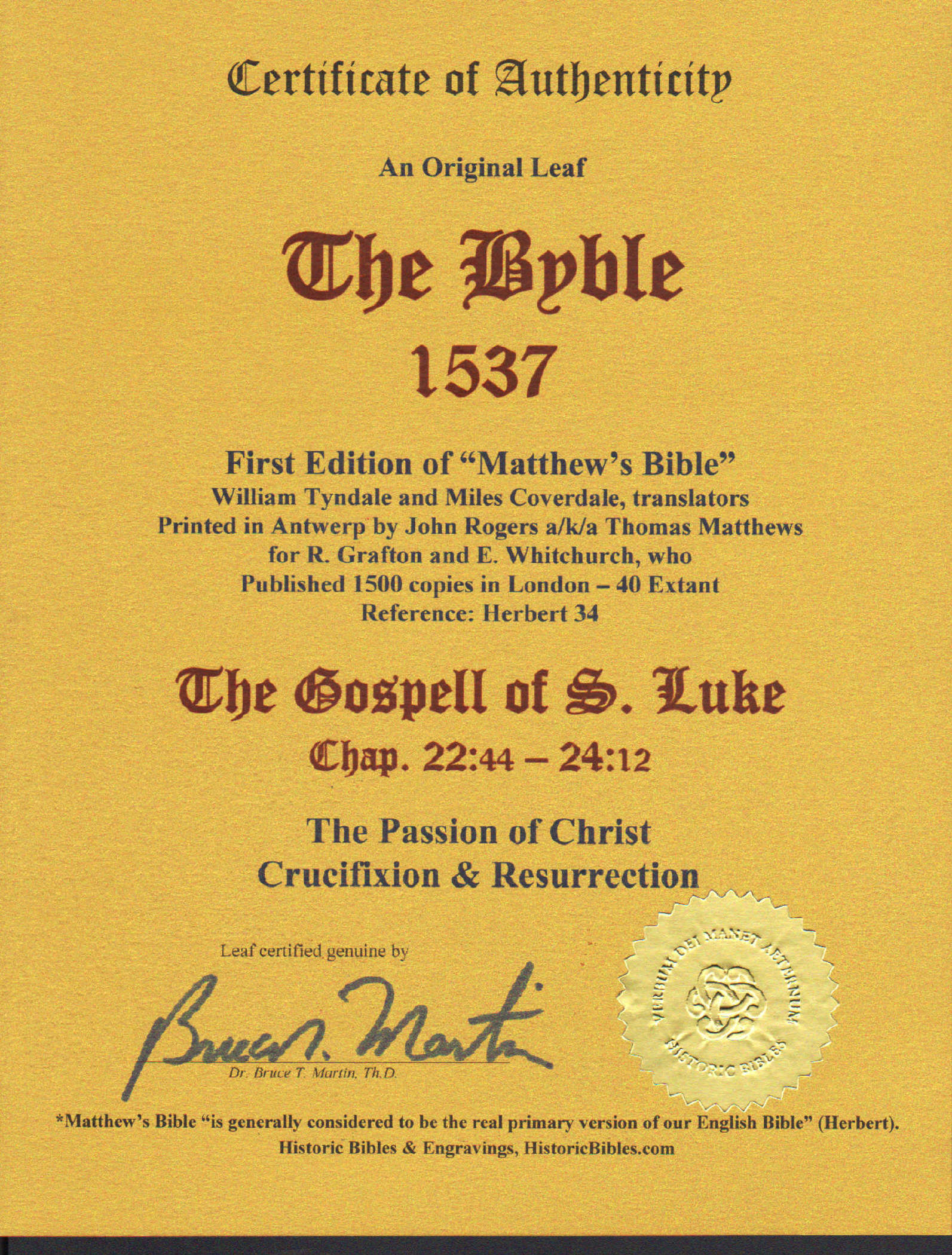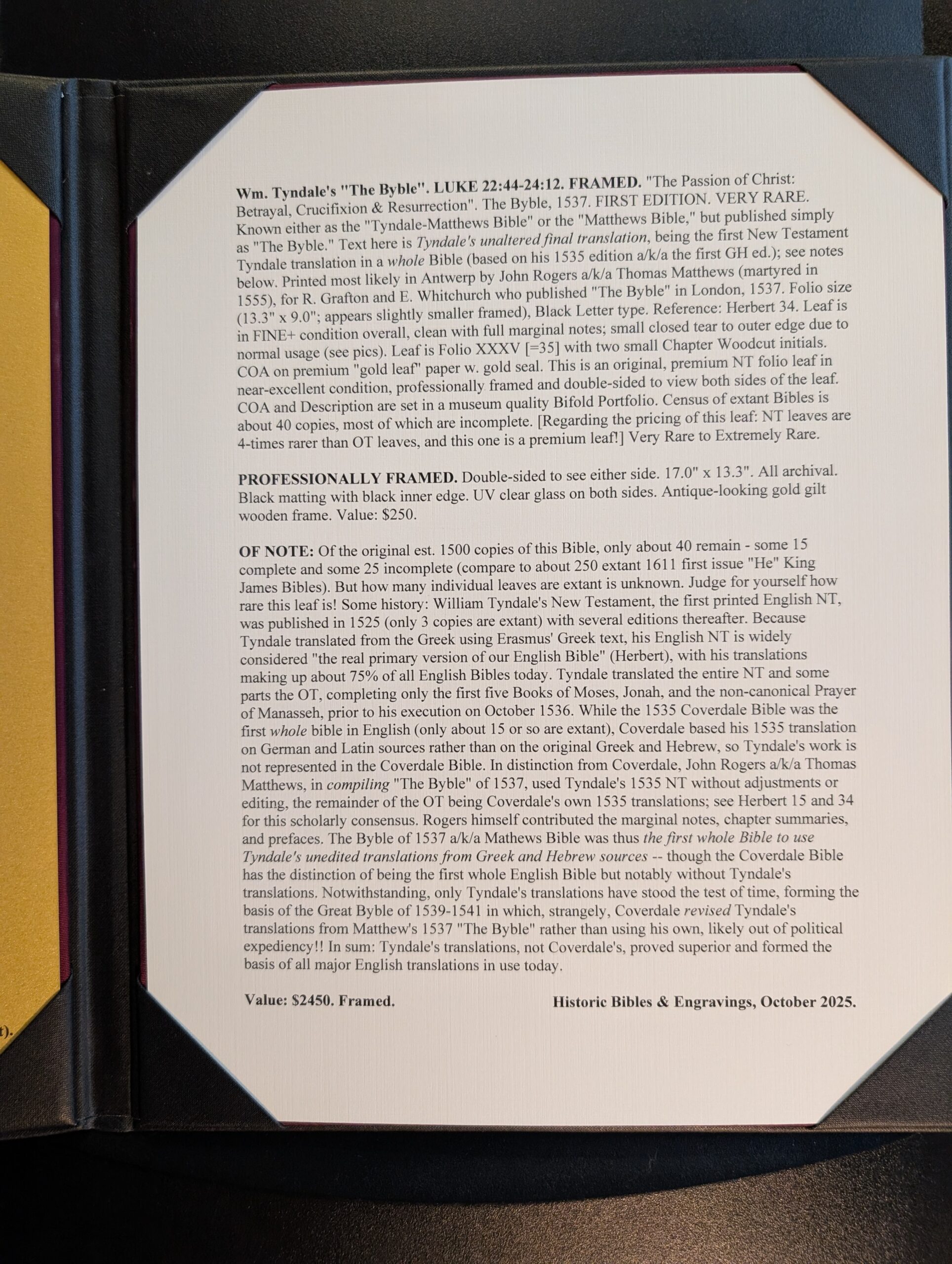 Wm. Tyndale’s “The Byble”. LUKE 22:44-24:12. FRAMED. “The Passion of Christ: Betrayal, Crucifixion & Resurrection”. The Byble, 1537. FIRST EDITION. VERY RARE. Known either as the “Tyndale-Matthews Bible” or the “Matthews Bible,” but published simply as “The Byble.” Text here is Tyndale’s unaltered final translation, being the first New Testament Tyndale translation in a whole Bible (based on his 1535 edition a/k/a the first GH ed.); see notes below. Printed most likely in Antwerp by John Rogers a/k/a Thomas Matthews (martyred in 1555), for R. Grafton and E. Whitchurch who published “The Byble” in London, 1537. Folio size, 13.3″ x 9.0″, Black Letter type. Reference: Herbert 34. Leaf is in FINE+ condition overall, clean with full marginal notes; small closed tear to outer edge due to normal usage (see pics). Leaf is Folio XXXV [=35] with two small Chapter Woodcut initials. See the final pictures for an exact comparison to this leaf, from a facsimile of the 1537 Matthews Bible. COA on premium “gold leaf” paper w. gold seal. This is an original, premium NT folio leaf in near-excellent condition, professionally framed and double-sided to view both sides of the leaf. COA and Description are set in a museum quality Bifold Portfolio. Census of extant Bibles is about 40 copies, most of which are incomplete. [Regarding the pricing of this leaf: NT leaves are 4-times rarer than OT leaves, and this one is a premium leaf!] Very Rare to Extremely Rare.
