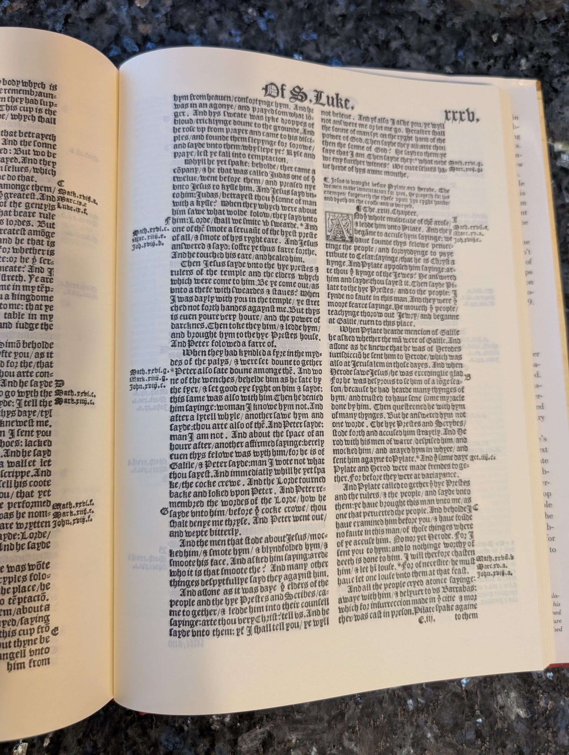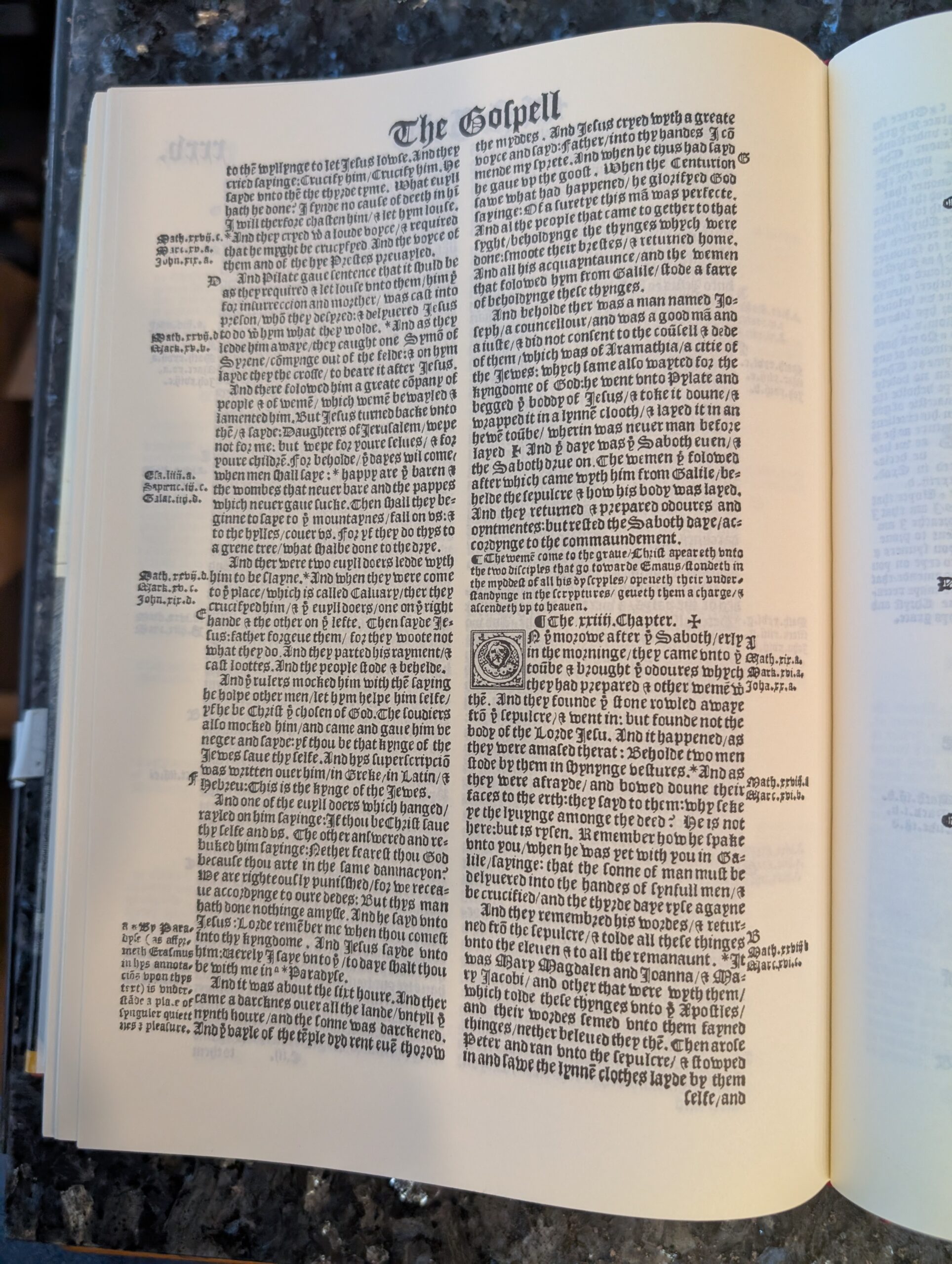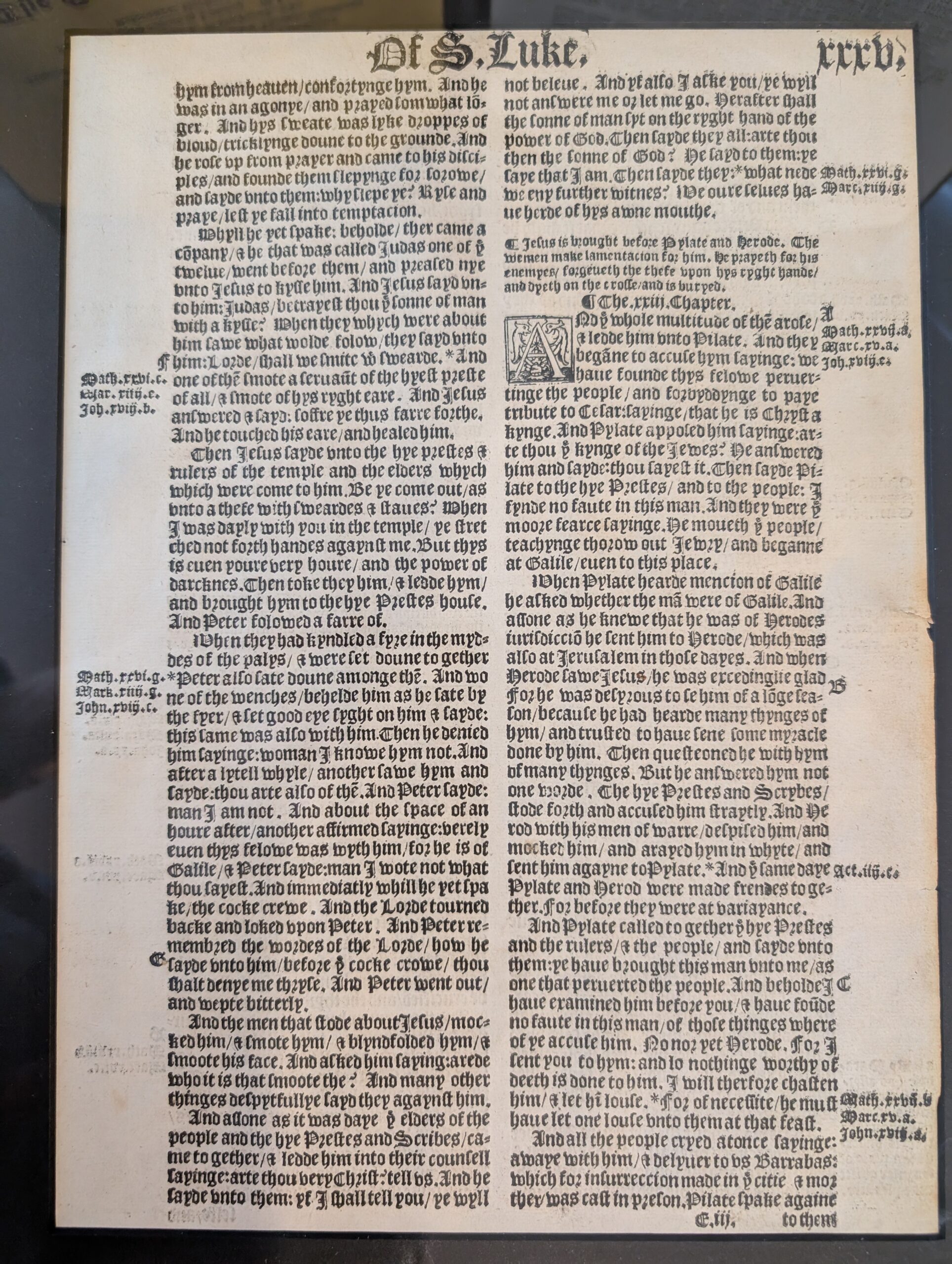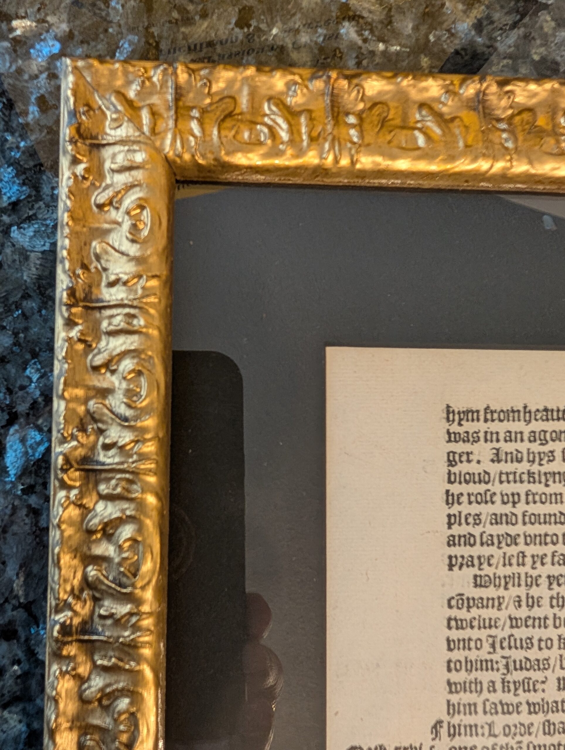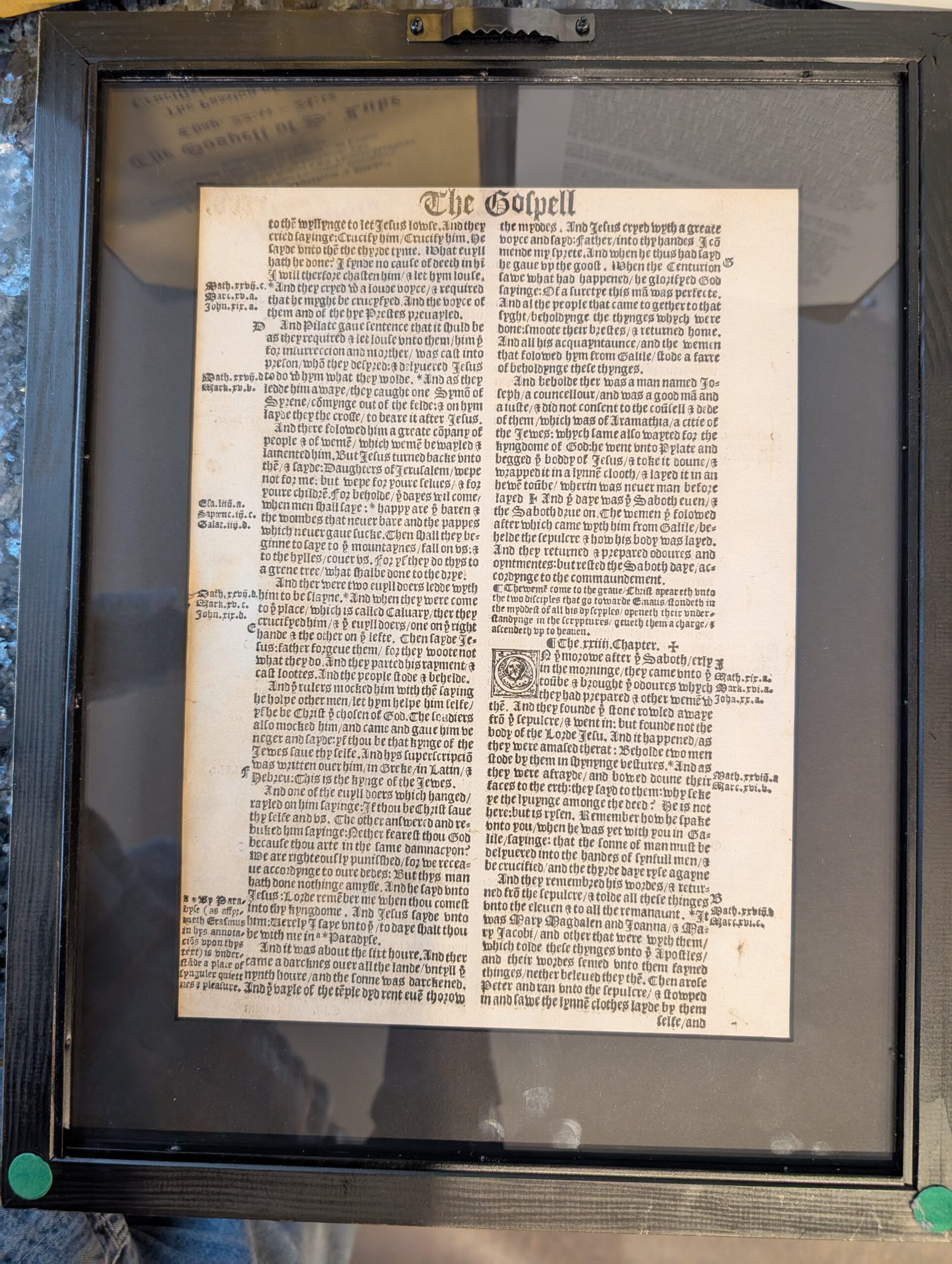 Wm. Tyndale’s “The Byble”. LUKE 22:44-24:12. FRAMED. “The Passion of Christ: Betrayal, Crucifixion & Resurrection”. The Byble, 1537. FIRST EDITION. VERY RARE. Known either as the “Tyndale-Matthews Bible” or the “Matthews Bible,” but published simply as “The Byble.” Text here is Tyndale’s unaltered final translation, being the first New Testament Tyndale translation in a whole Bible (based on his 1535 edition a/k/a the first GH ed.); see notes below. Printed most likely in Antwerp by John Rogers a/k/a Thomas Matthews (martyred in 1555), for R. Grafton and E. Whitchurch who published “The Byble” in London, 1537. Folio size, 13.3″ x 9.0″, Black Letter type. Reference: Herbert 34. Leaf is in FINE+ condition overall, clean with full marginal notes; small closed tear to outer edge due to normal usage (see pics). Leaf is Folio XXXV [=35] with two small Chapter Woodcut initials. See the final pictures for an exact comparison to this leaf, from a facsimile of the 1537 Matthews Bible. COA on premium “gold leaf” paper w. gold seal. This is an original, premium NT folio leaf in near-excellent condition, professionally framed and double-sided to view both sides of the leaf. COA and Description are set in a museum quality Bifold Portfolio. Census of extant Bibles is about 40 copies, most of which are incomplete. [Regarding the pricing of this leaf: NT leaves are 4-times rarer than OT leaves, and this one is a premium leaf!] Very Rare to Extremely Rare.