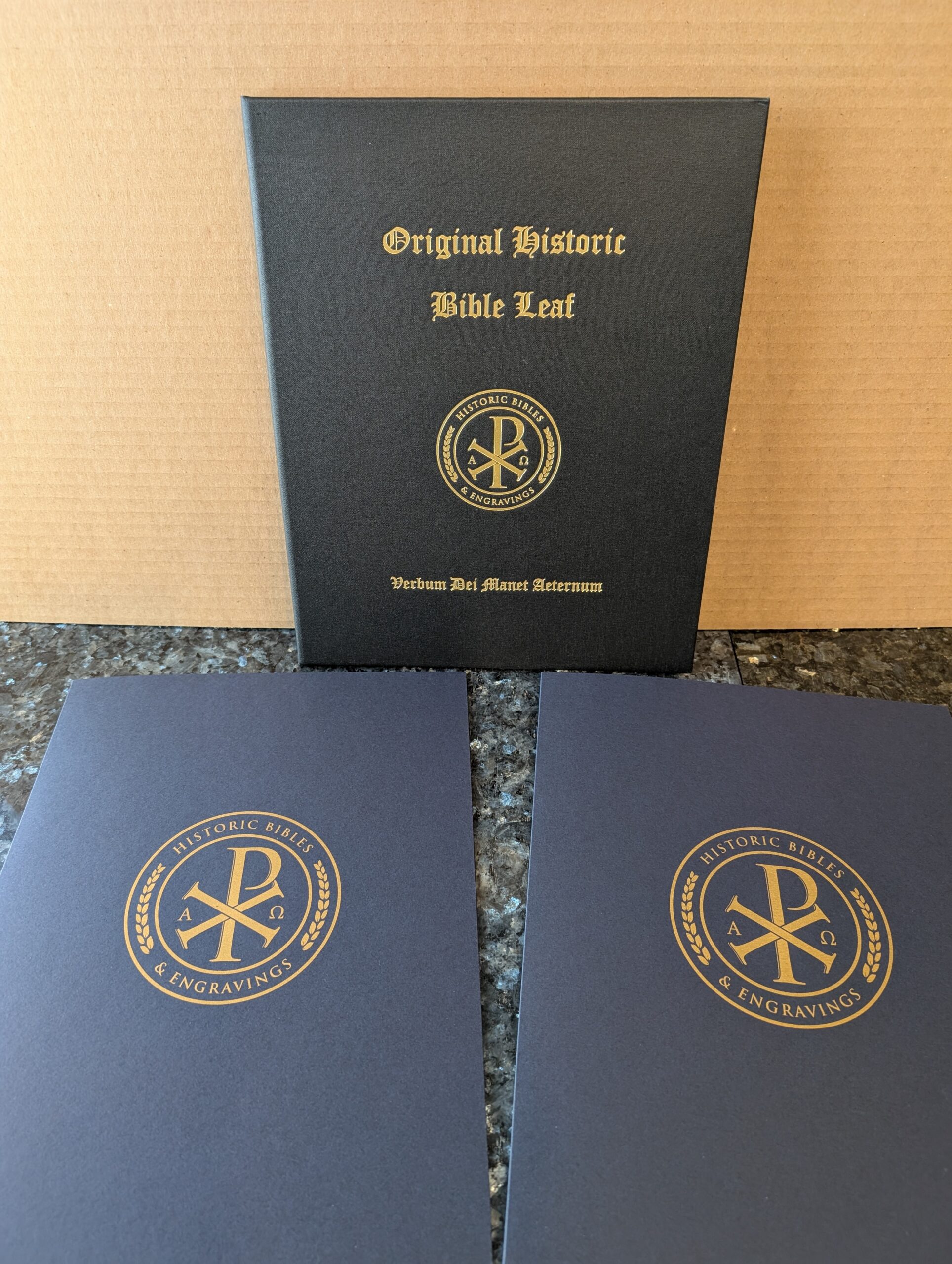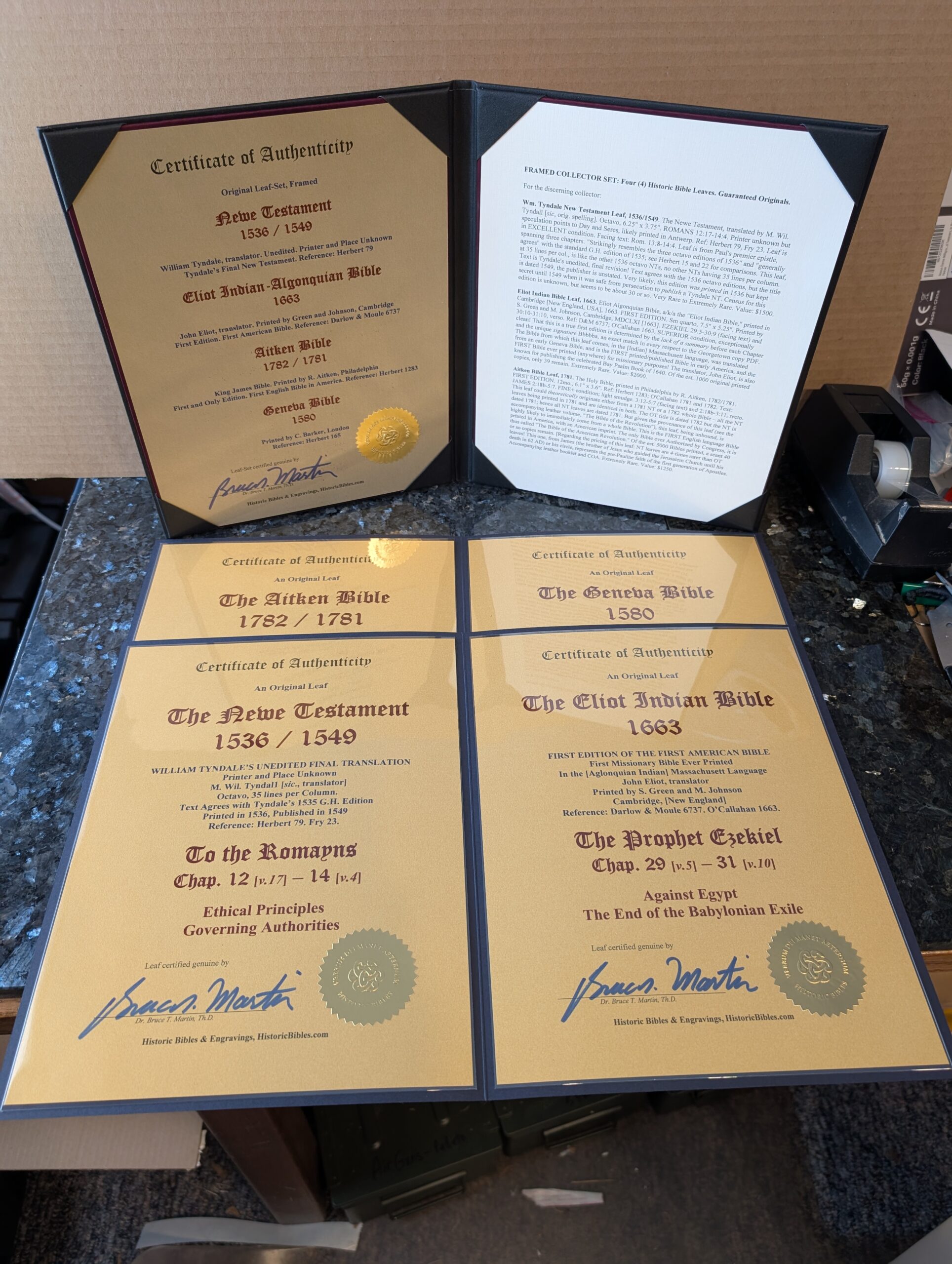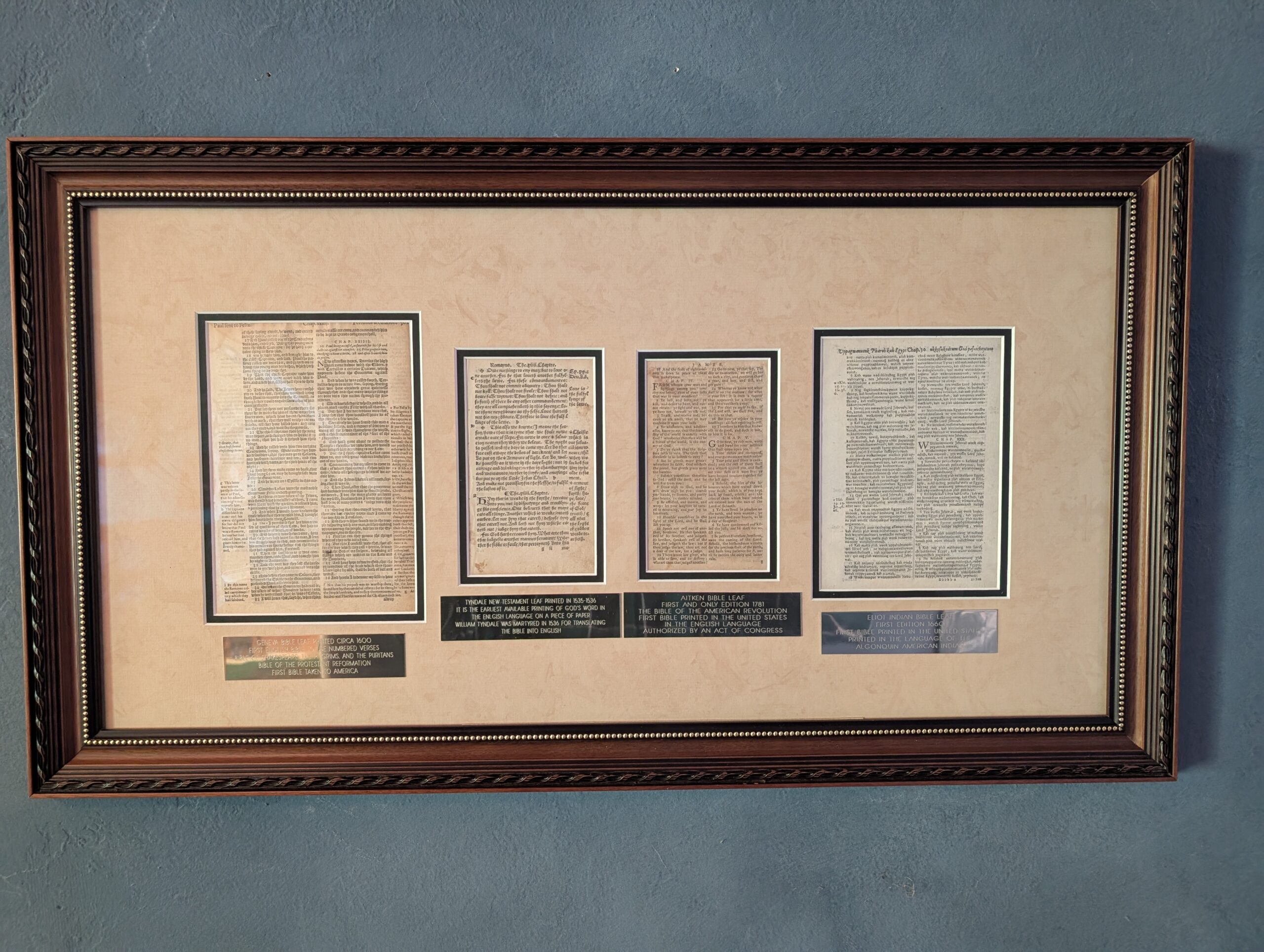 FRAMED COLLECTOR SET: Four (4) Historic Bible Leaves. Guaranteed Genuine Originals.