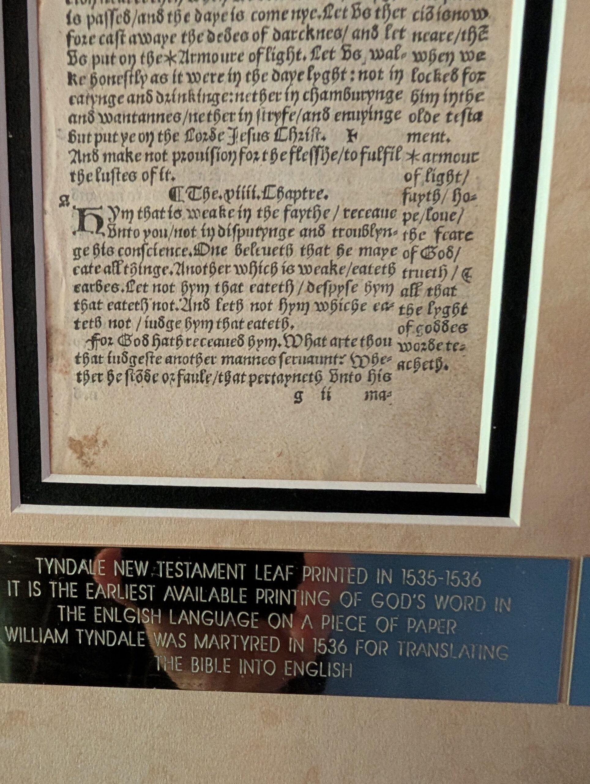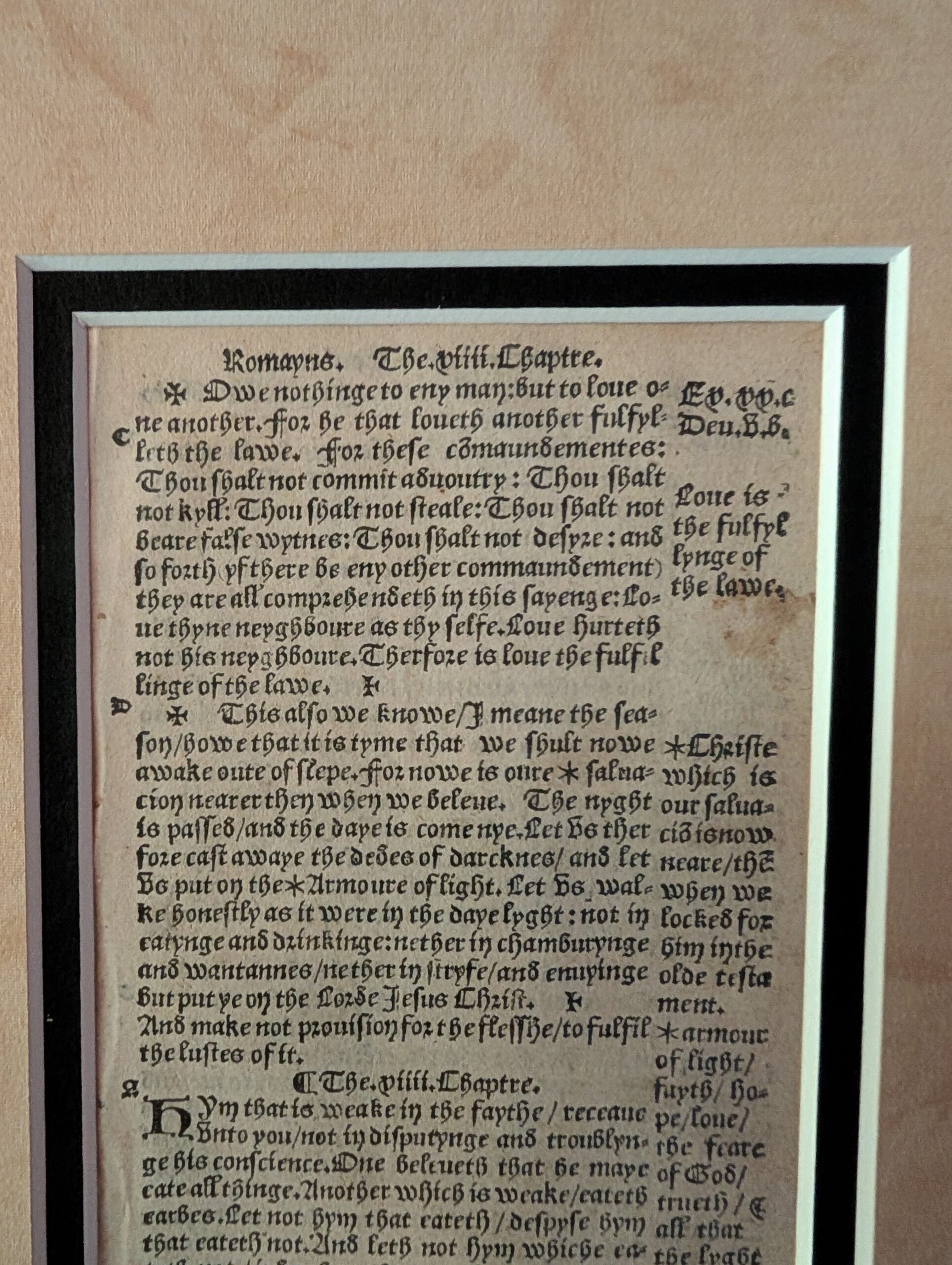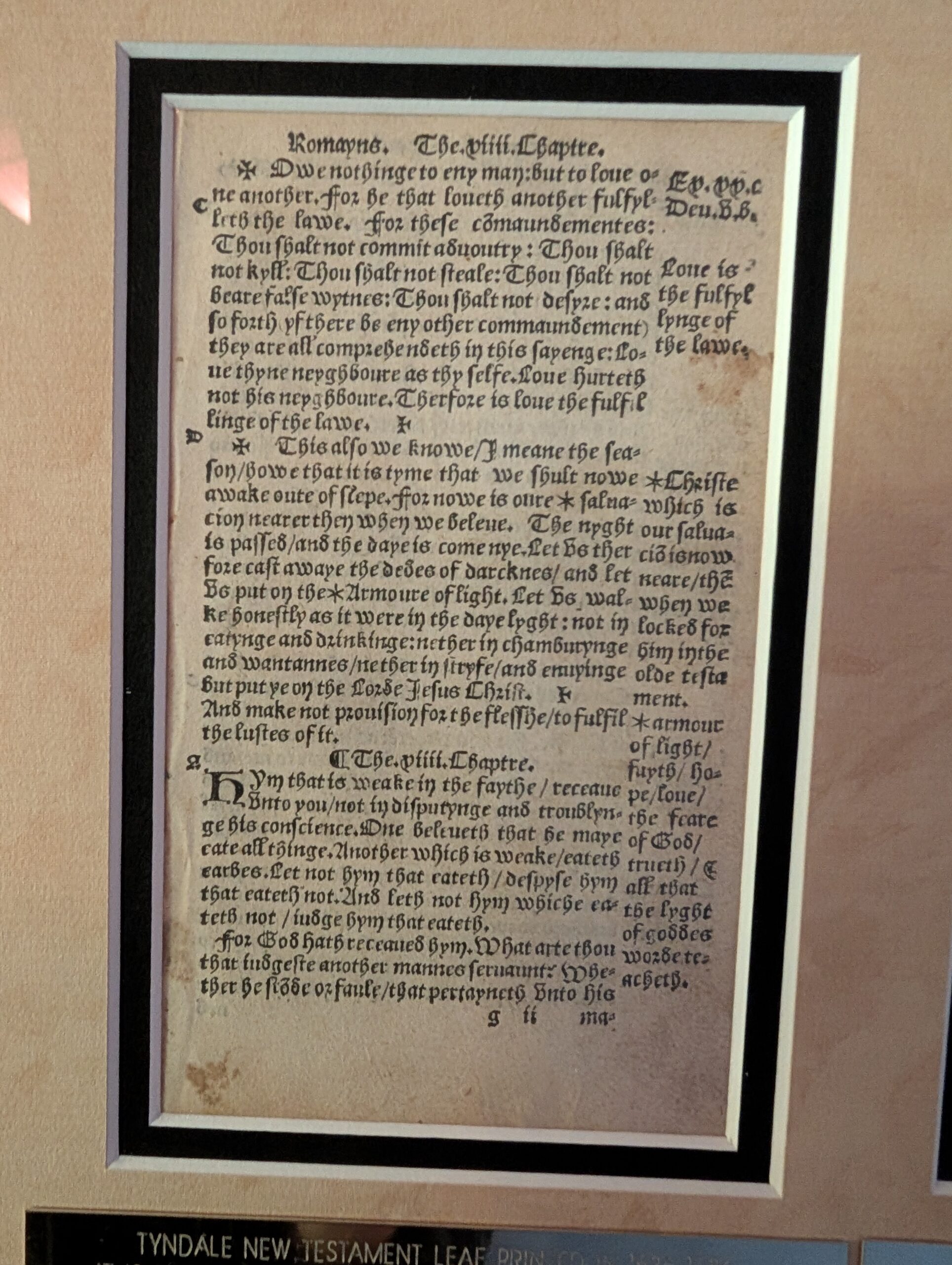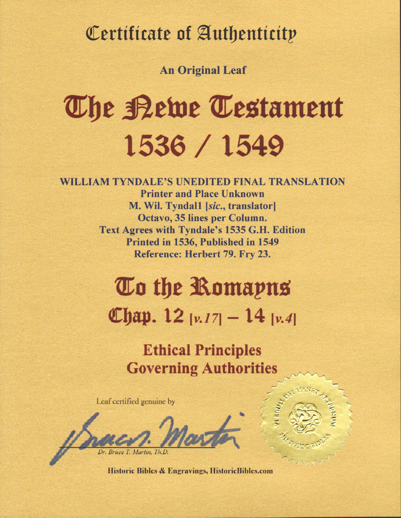 Wm. Tyndale New Testament Leaf, 1536/1549. The Newe Testament, translated by M. Wil. Tyndall [sic, orig. spelling]. Octavo, 6.25″ x 3.75″. ROMANS 12:17-14:4. Printer unknown but speculation points to Day and Seres, and was likely printed in Antwerp. Leaves not numbered; paragraph ending flared “Iron” crosses lack the left arm (as in H 13, suggesting a common printer?), with copious marginal references, and the marginal stars are 6-pointed. Ref: Herbert 79, Fry 23. EXCELLENT condition. Facing text: Rom. 13:8-14:4. Leaf is from Paul’s premier epistle, spanning chapters 12-14. Overall, this edition “Strikingly resembles the three octavo editions of 1536” and “generally agrees” with the standard G.H. edition of 1535; see Herbert 15 and 22 for comparisons. With 35 lines per col., this leaf in form is like the other three known 1536 octavo NTs, no other NTs having 35 lines per column. Text here is Tyndale’s unedited, final revision! Although the text here generally agrees with the 1536 octavo editions, the Title is dated 1549 and the publisher is unstated. Very likely, this edition was printed in 1536 but kept secret until 1549 when it was safe from persecution to publish a Tyndale NT. [Not to be confused with the 1549 Tyndale quarto NT, H 77]. Census for the three known 1536 editions is about 15. The census for this unusual edition is unknown, but perhaps 20-30. Regarding the pricing of this leaf: NT leaves are 4-times rarer than OT leaves, and this one is a premium leaf. Extremely Rare. Value: $1500.