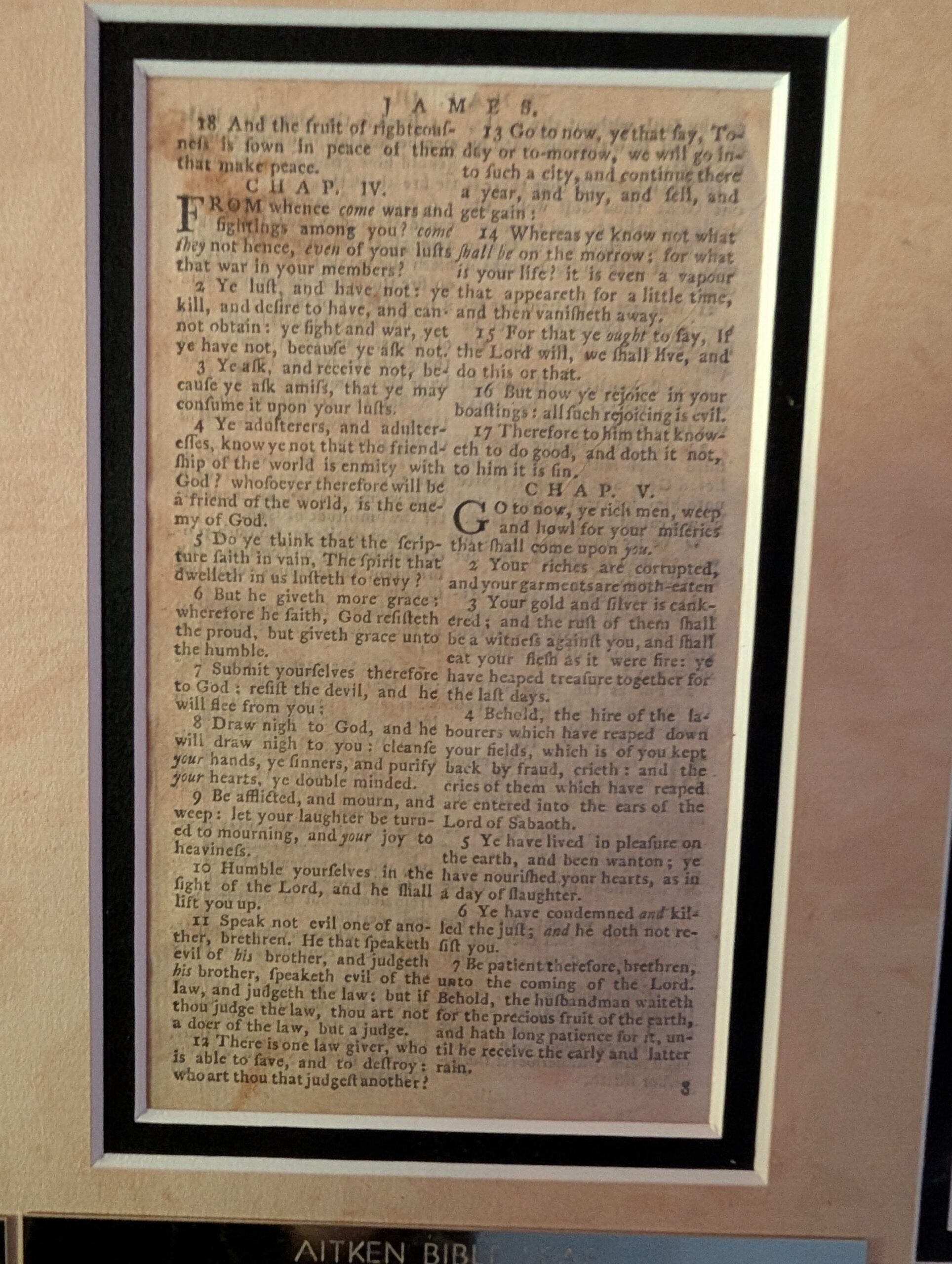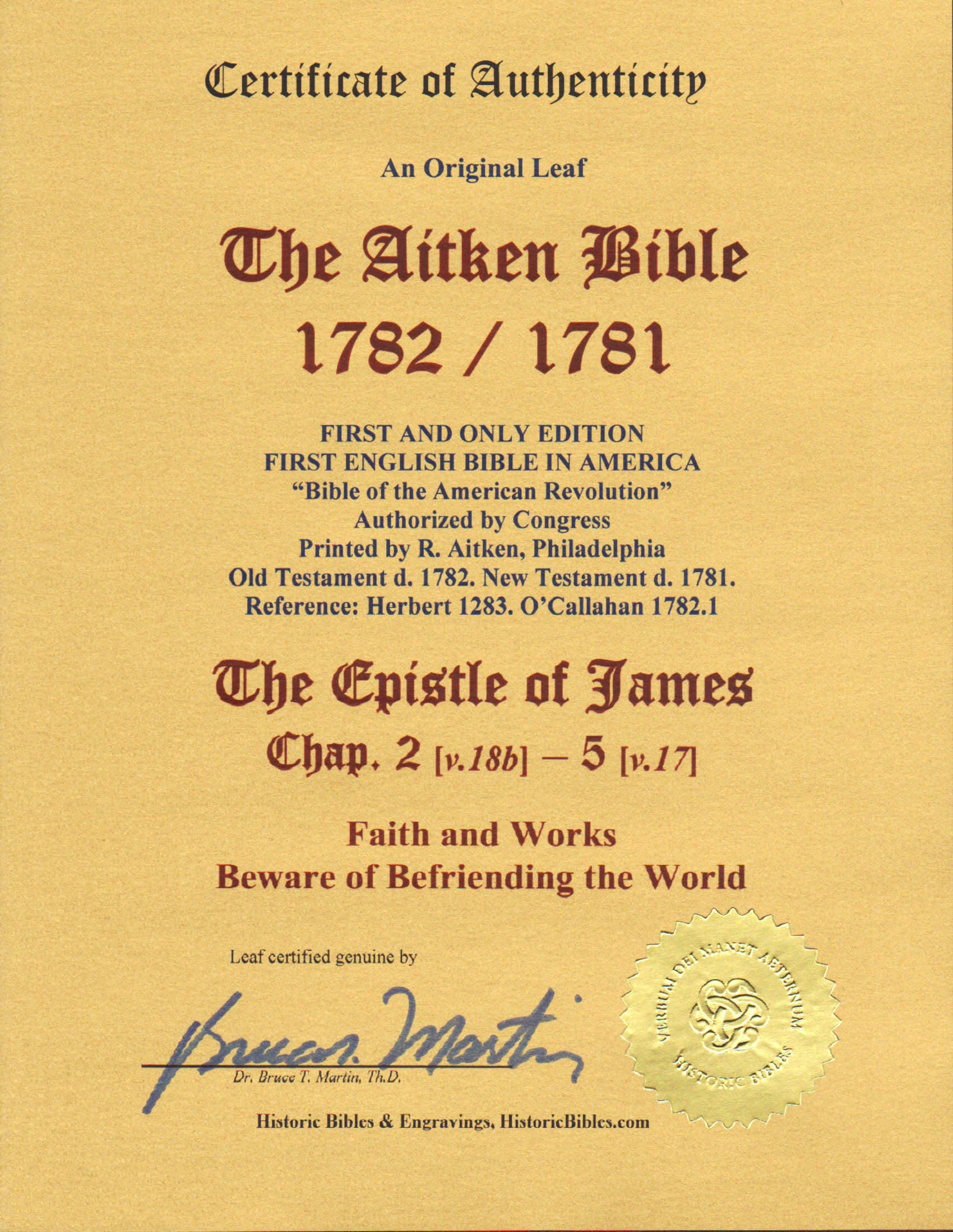 Aitken Bible Leaf, 1781. The New Testament / Holy Bible, printed in Philadelphia by R. Aitken, 1781 or 1782/1781. FIRST EDITION. 12mo., 6.1″ x 3.6″. Ref: Herbert 1283; O’Callahan 1781 and 1782. Text: JAMES 2:18b-5:7. FINE+ condition; light smudge. 3:12-5:7 (facing text) and 2:18b-3:11, recto. This leaf could theoretically originate either in a 1781 NT or a 1782 whole Bible — the NT leaves being identical in both. In the 1782 Bible, the OT title is dated 1782 but the NT is dated 1781. But given the provenance of this leaf (see the accompanying leather volume, “The Bible of the Revolution”), this leaf, being unbound, is highly likely to immediately come from a whole Bible. This is the FIRST English language Bible printed in America, with an American imprint. The only Bible ever Authorized by Congress, it is thus called “The Bible of the American Revolution.” Of the 5000 copies printed, a scant 40 or so copies remain. Regarding the pricing of this leaf: NT leaves are 4-times rarer than OT leaves! This one, from James (the brother of Jesus who guided the Jerusalem Church until his death in 62 AD) or his circle, represents the faith of the first Apostles. Accompanying leather booklet and COA. Extremely Rare. Value: $1250.