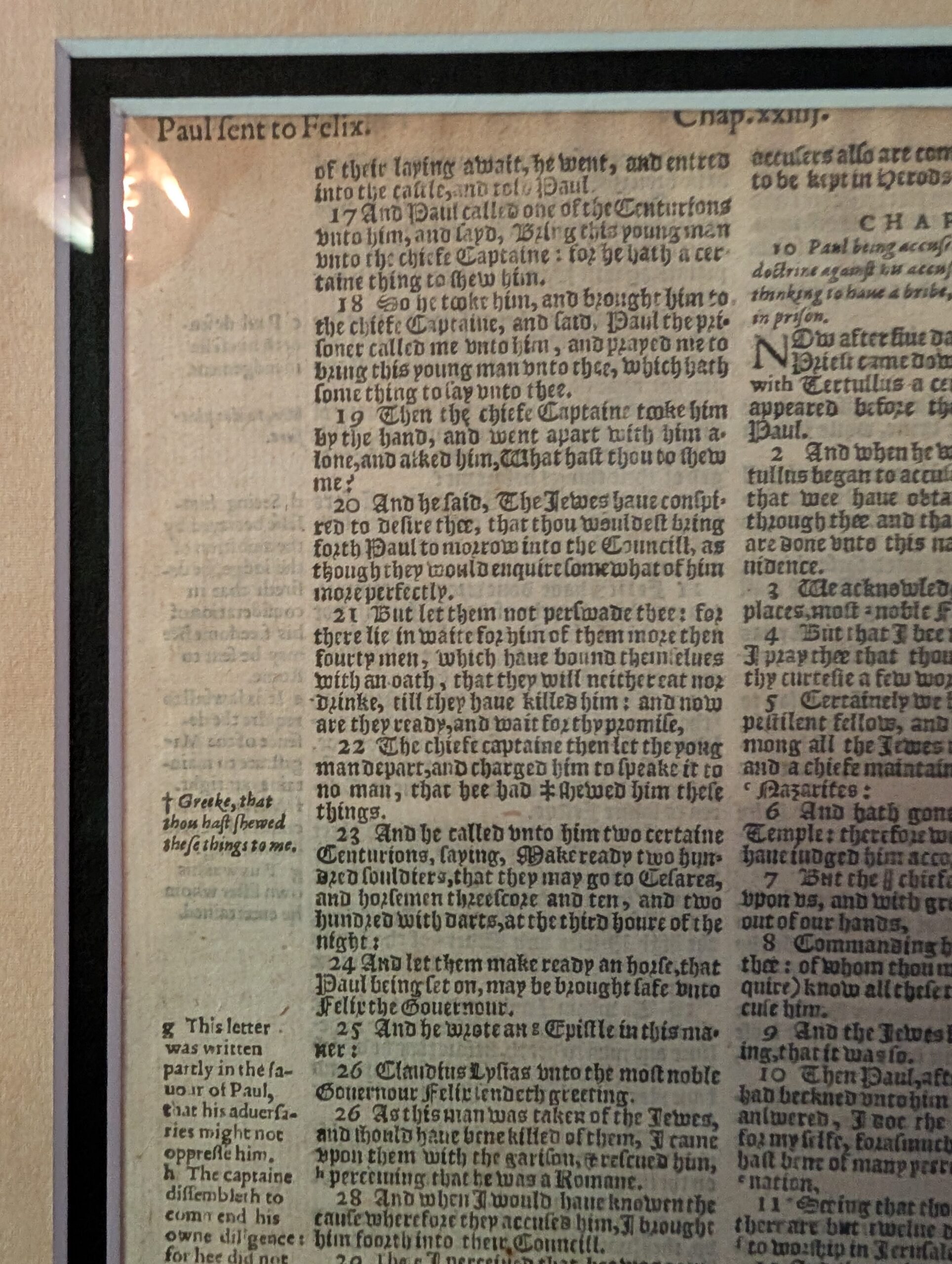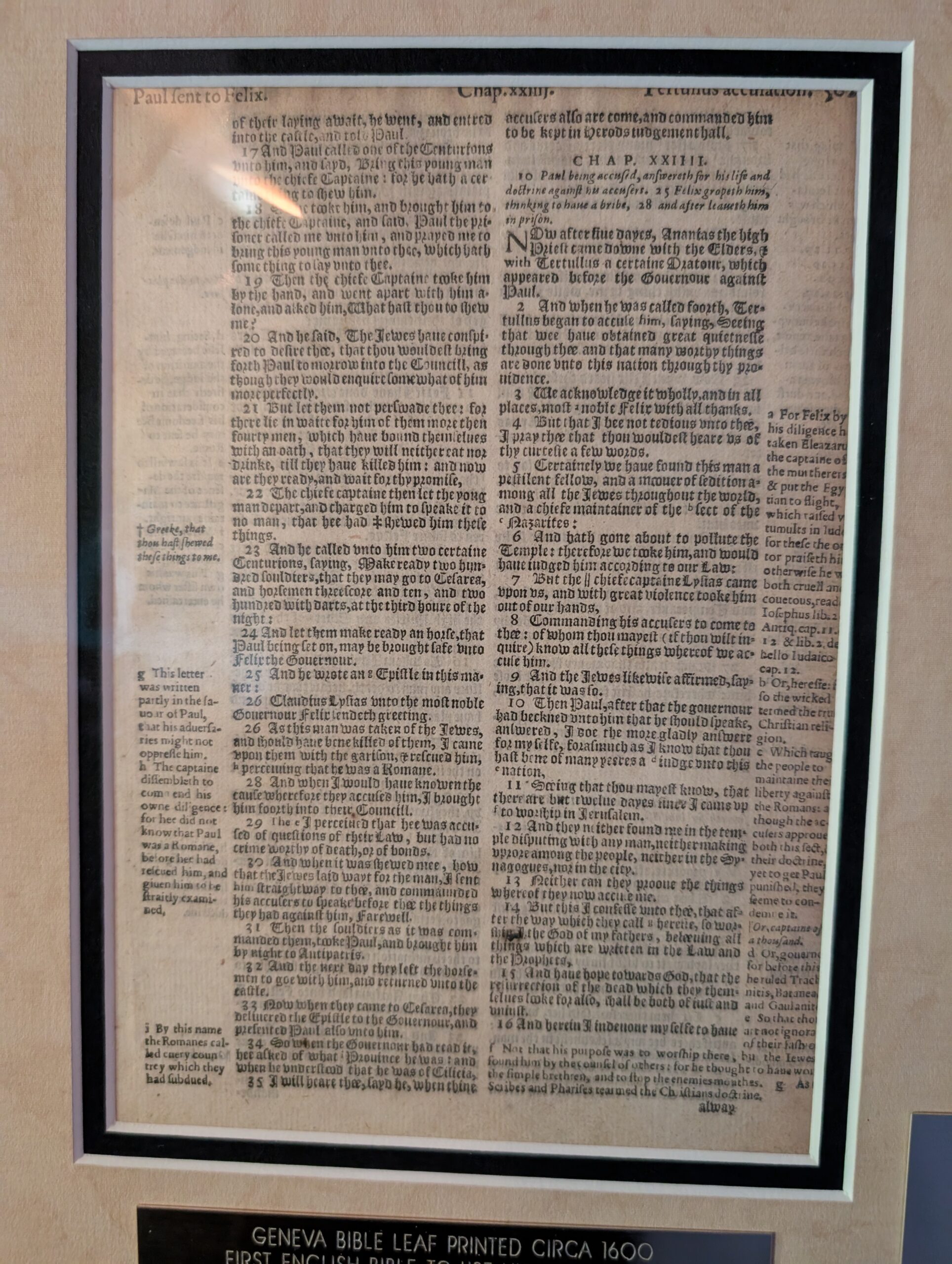 Geneva Bible Leaf, 1580. The Geneva Bible, printed in London by C. Barker, 1580; a reprint of the 1579 edition. Quarto, 8.5″ x 6.0″; 71 lines per column. Ref: Herbert 165. Text: ACTS 23:16b-25:23. FINE condition overall; light stain at upper corner. Facing text: Acts 23:16b-24:16a; verso: 24:16b-25:23. The Geneva Bible popularized the Quarto format for personal use and dominated the English speaking world until about 1680. Text recounts Paul’s detainment in Jerusalem and his appeal to Caesar. While this leaf is not particularly valuable, it well represents the impact of the Geneva Bible in the historical development of the English Bible. Value: $50.