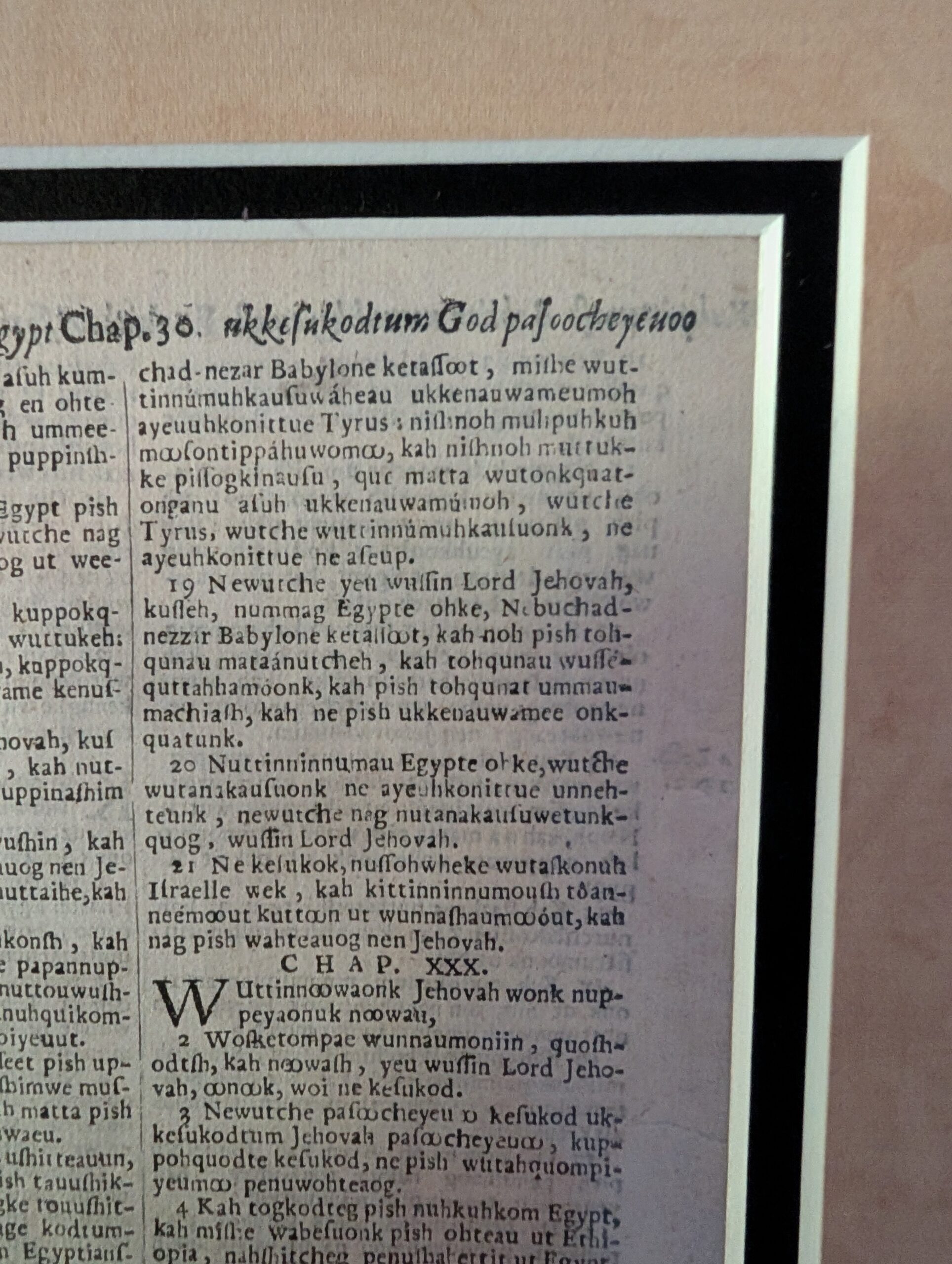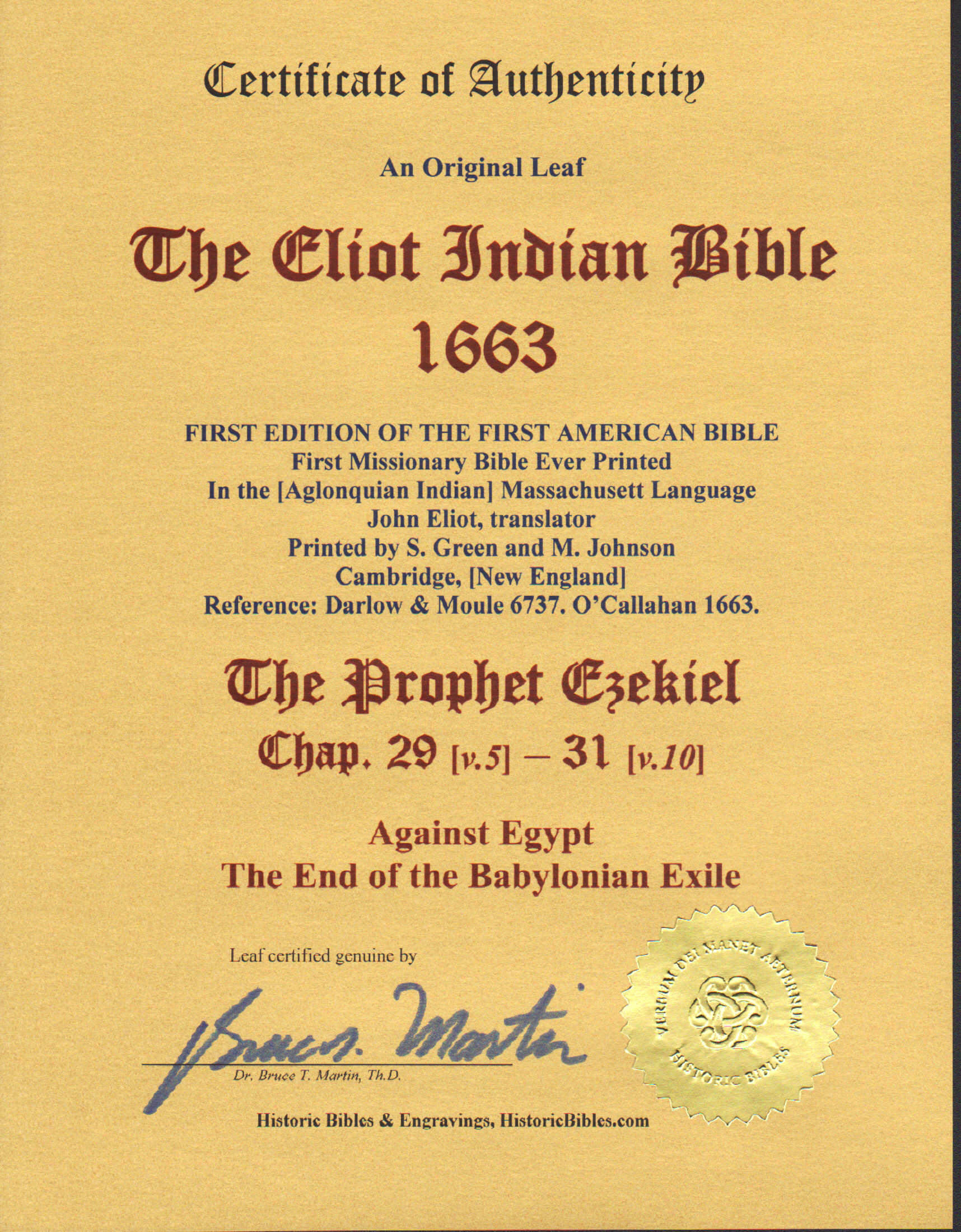 Eliot Indian Bible Leaf, 1663. Eliot Algonquian Bible, a/k/a “Eliot Indian Bible,” printed in Cambridge [New England, USA], 1663. FIRST EDITION. Sm quarto, 7.5″ x 5.25″. Printed by S. Green and M. Johnson, Cambridge, MDCLXI [1663]. EZEKIEL 29:5-30:9 (facing text) and 30:10-31:10, verso. Ref: D&M 6737; O’Callahan 1663. SUPERIOR condition. That this is a true first edition is determined by the lack of a summary before each Chapter as well as the unique signature Bbbbba, an exact match in every respect to the Georgetown copy PDF. The Bible from which this leaf comes, in the [Algonquian Indian] Massachusett language, translated from a Geneva Bible, is the first printed/published Bible in early America, and the first Bible ever printed for missionary purposes! The translator, John Eliot, is also known for publishing the Bay Psalm Book of 1640. Of the 1000 original printed copies, only 39 are known to remain. Extremely Rare. Value: $2000.