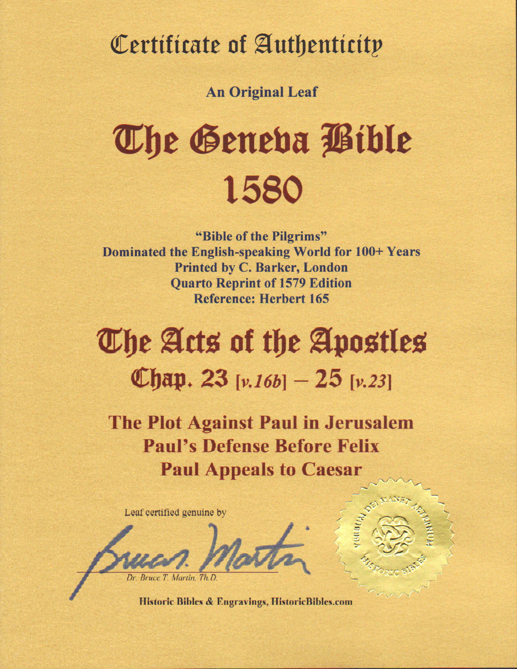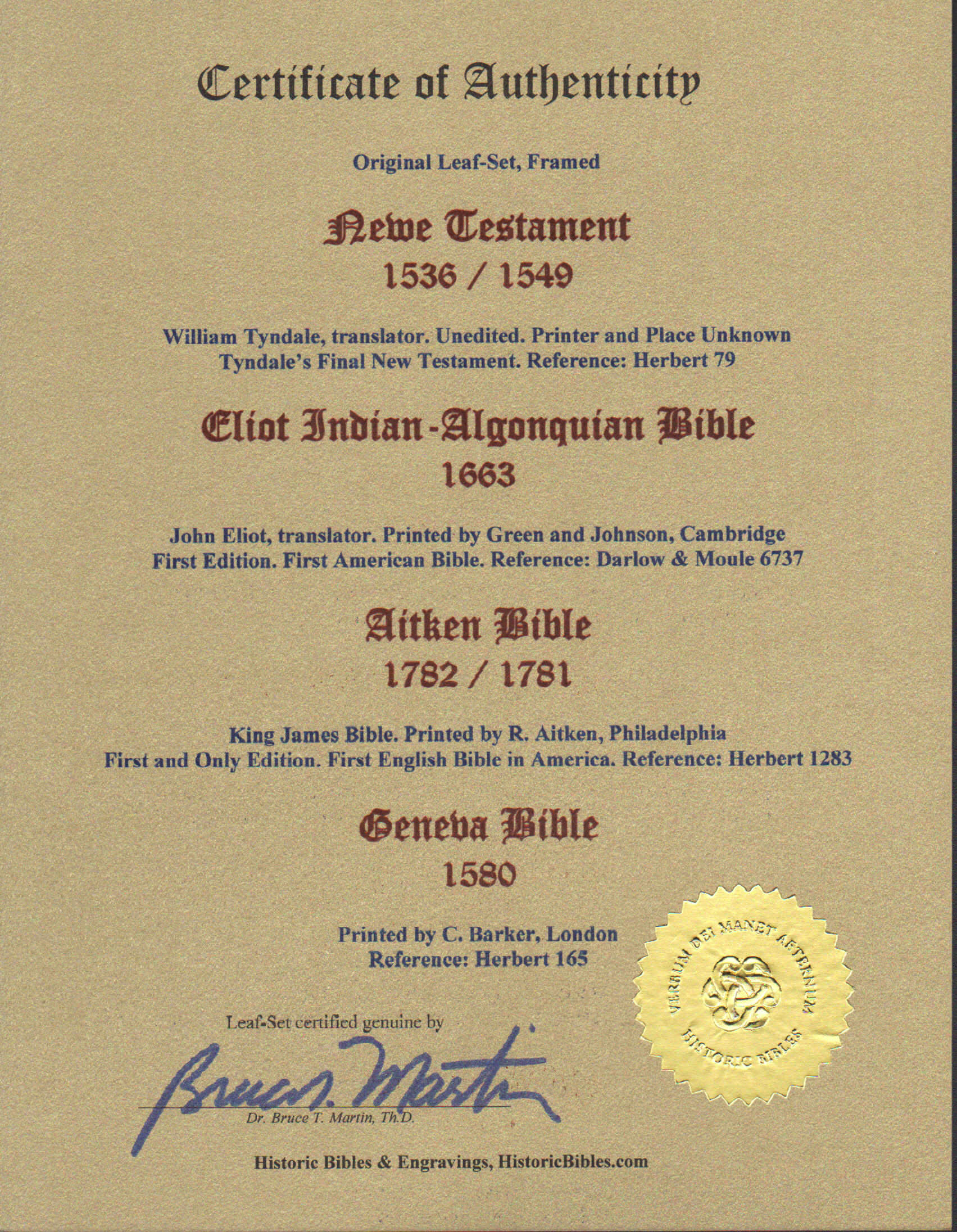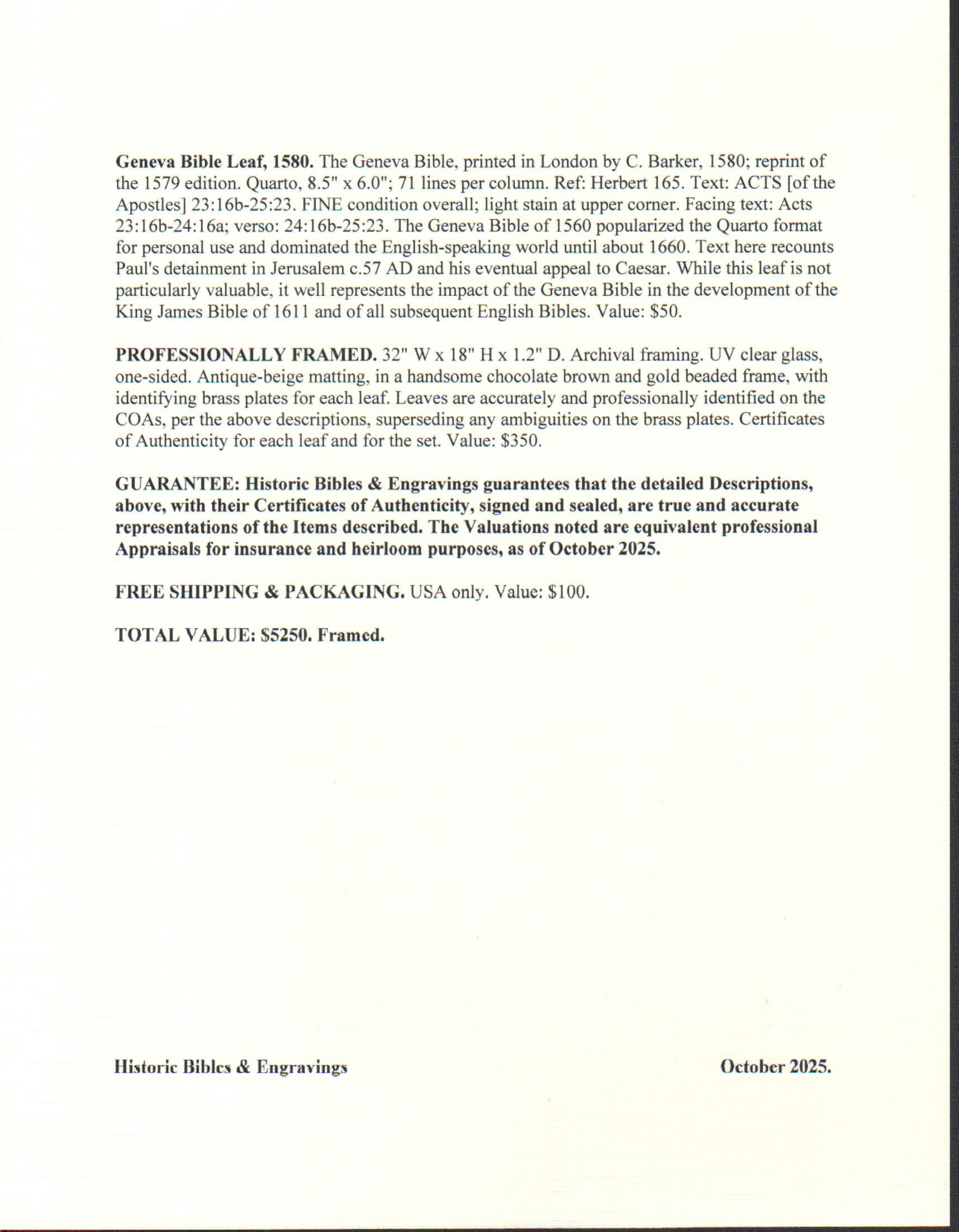 GUARANTEE: Historic Bibles & Engravings guarantees that the detailed Descriptions, above, with their Certificates of Authenticity, signed and sealed, are true and accurate representations of the Items described. The Valuations noted are equivalent professional Appraisals for insurance and heirloom purposes, as of October 2025.