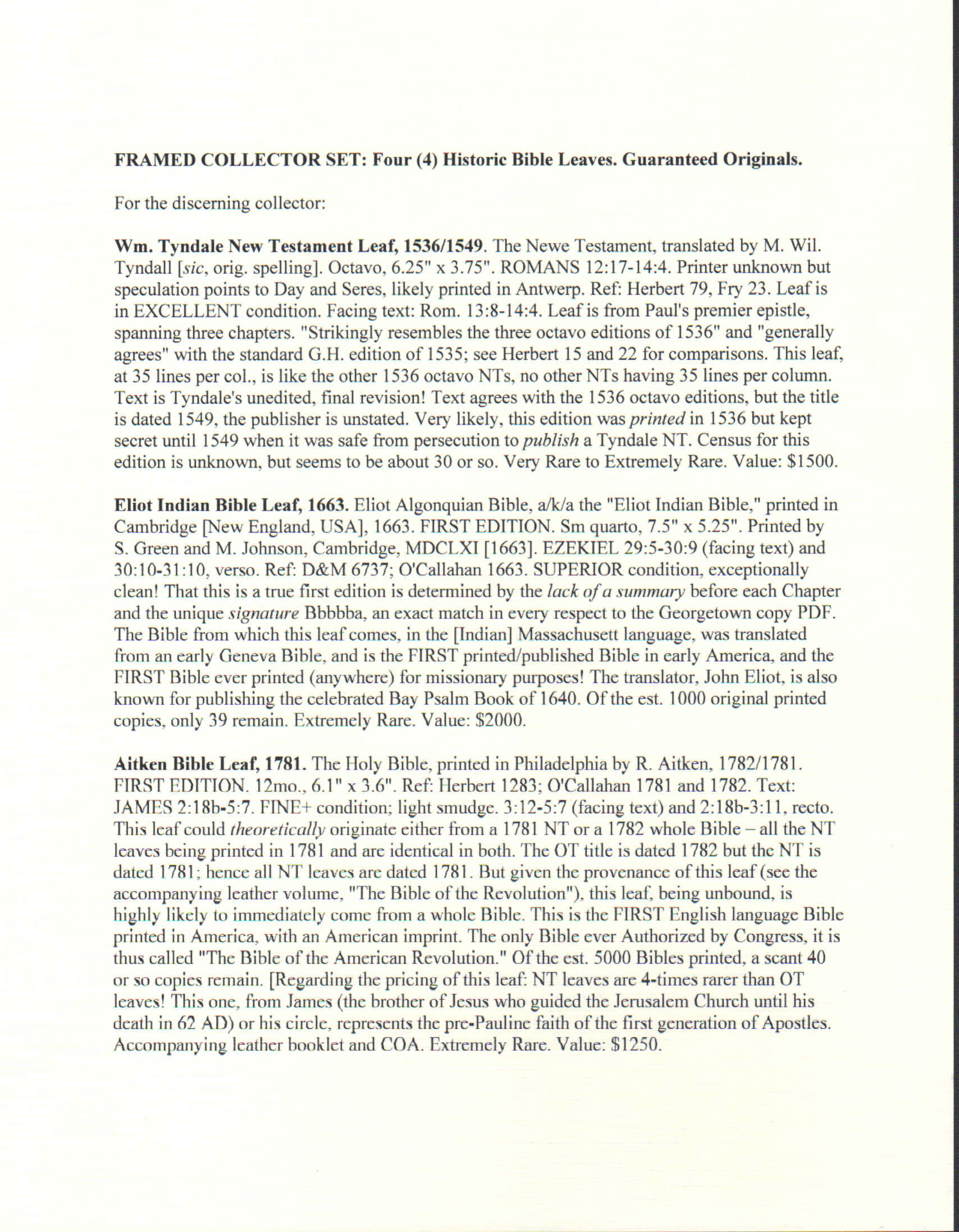 4 Leaf Set Includes: Four (4) Bibles Leaves, framed, as described and pictured; Leather Booklet titled “The Bible of the Revolution”; General COA and Descriptions for all 4 leaves set in a museum-quality Bifold Portfolio; 4 separate COAs in Archival Booklets.